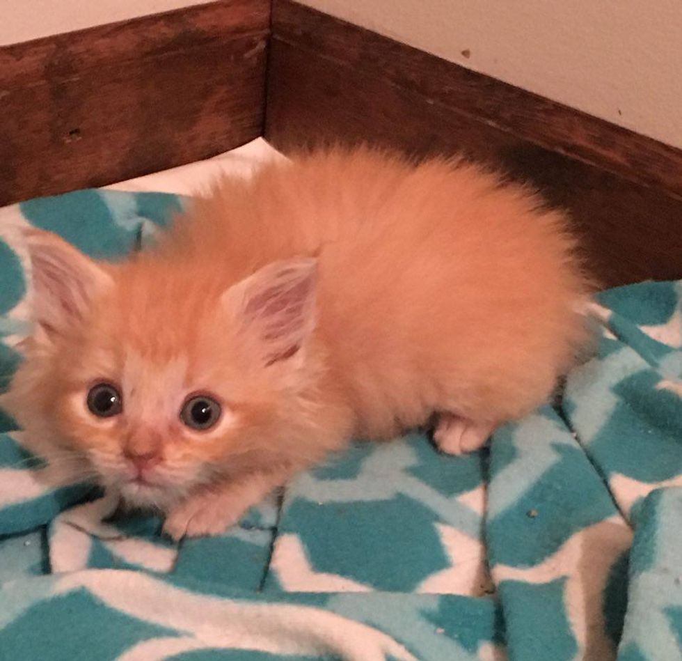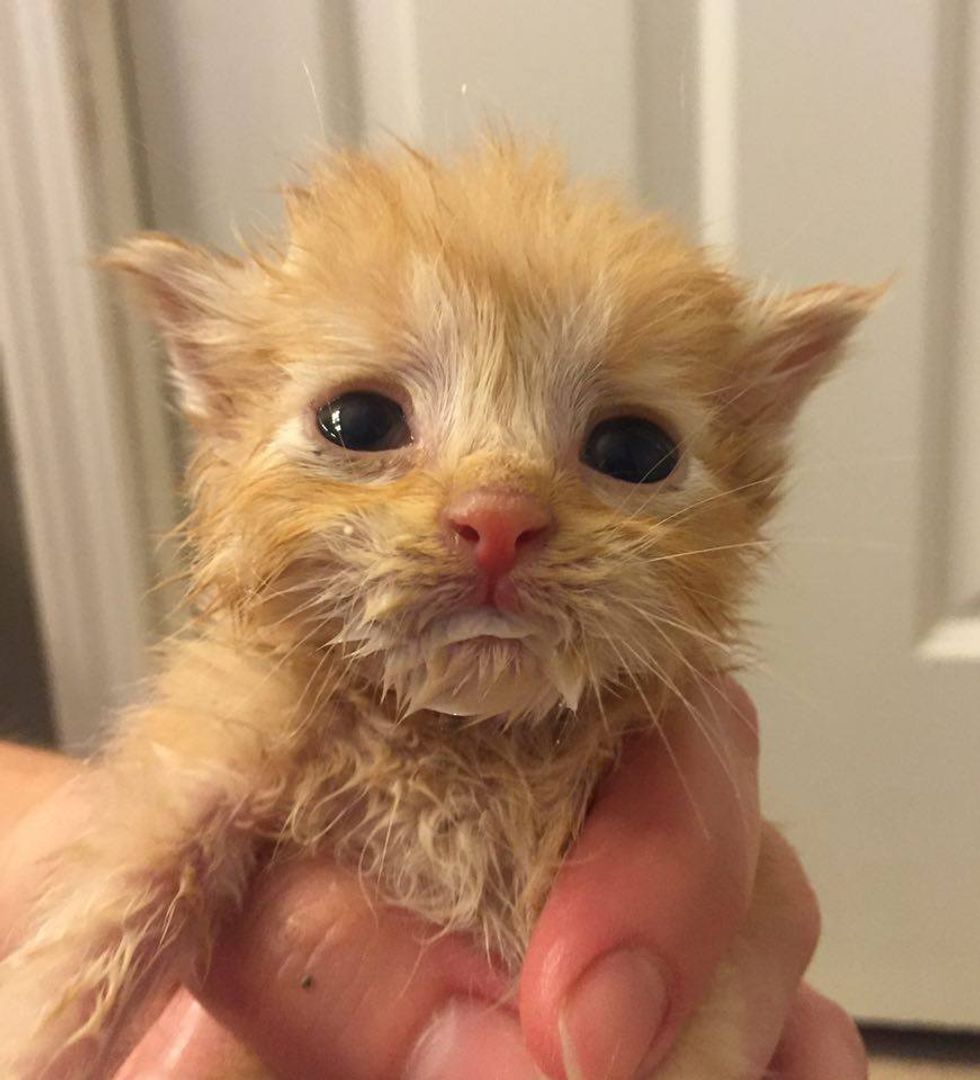 A tiny ginger kitten was found all alone, and his eyes were completely matted shut. In just a week, he can see, drink from his bottles like a champ, and has nine adopted siblings to play with.