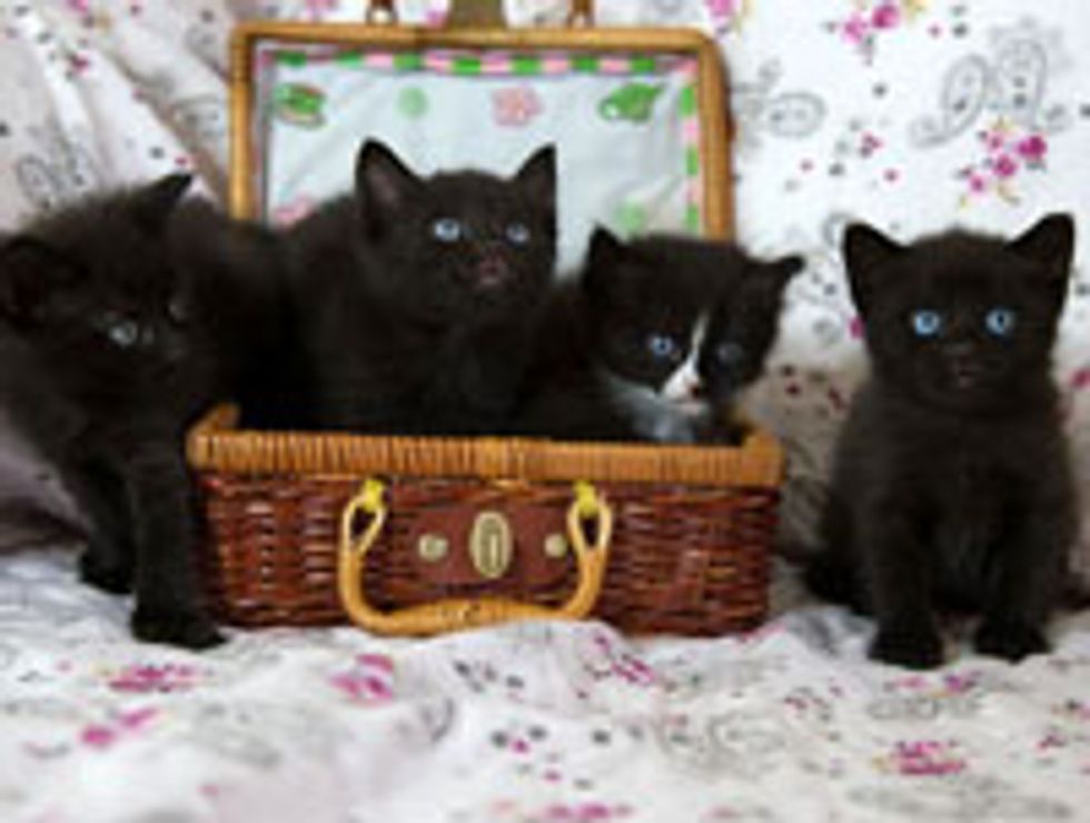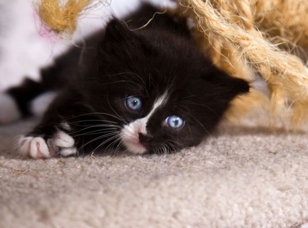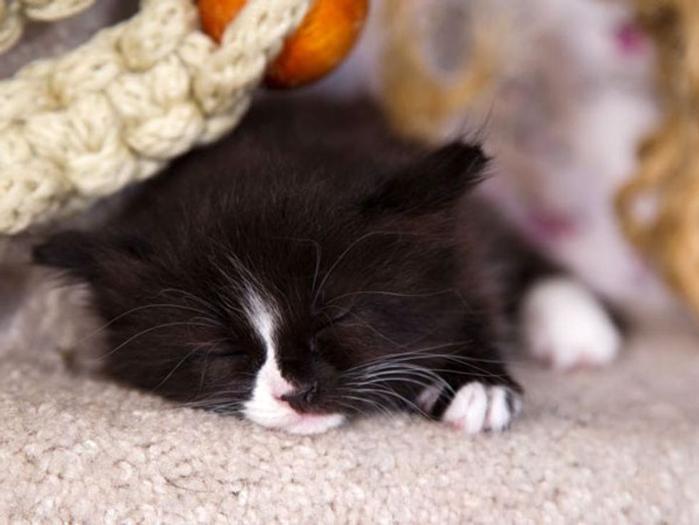 Snow is a little oddball in his litter. Among all the black kittens, he is the only one with a white stripe on his nose and 4 adorable white mittens. The little tuxedo definitely stands out.