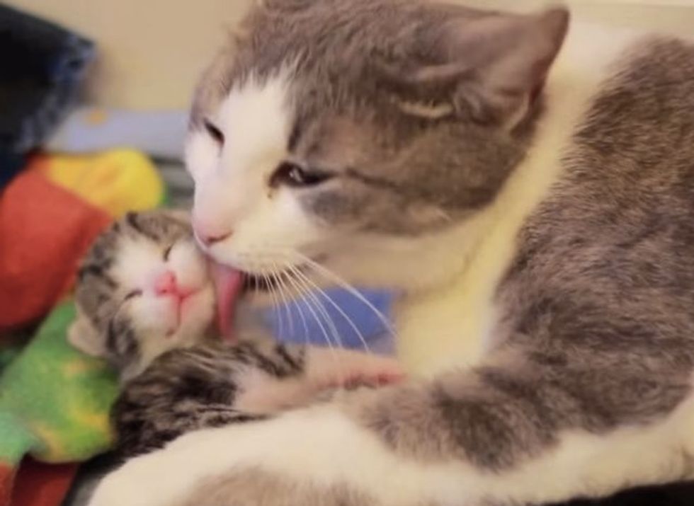 Five kittens were born in foster care. This is Winter the mama cat, a rescue stray, giving her baby a bath.