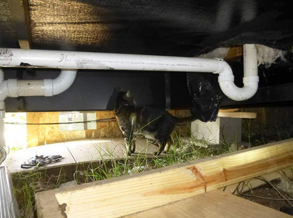 The entire time that we were searching under the trailer, Spirit was off lead. This was necessary for a number of reasons -- so that his leash would not get tangled up in the debris, or metal supports, and also because he needed the freedom and ability to thoroughly investigate the lowest areas, where the clearance was literally about 6-8 inches high -- too low for a person to reach on their own. We relied upon Spirit's ability to notify & alert us, and our boy did not disappoint!"