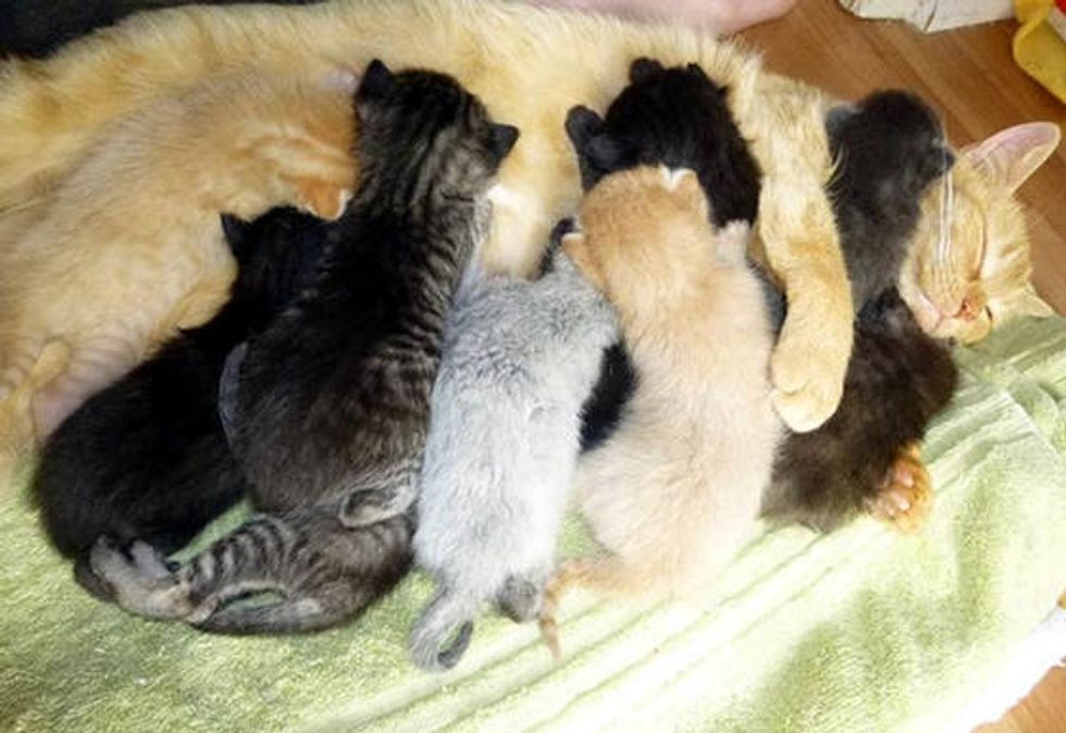 The 4 rescue kittens now have a surrogate mama, CC, who is nursing and caring for them along with her 5 kittens.