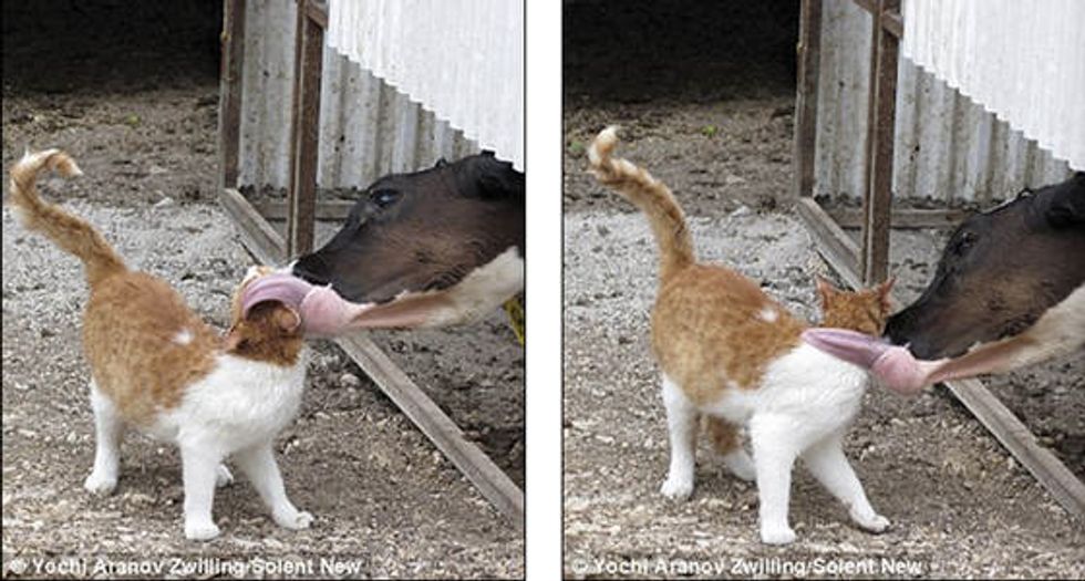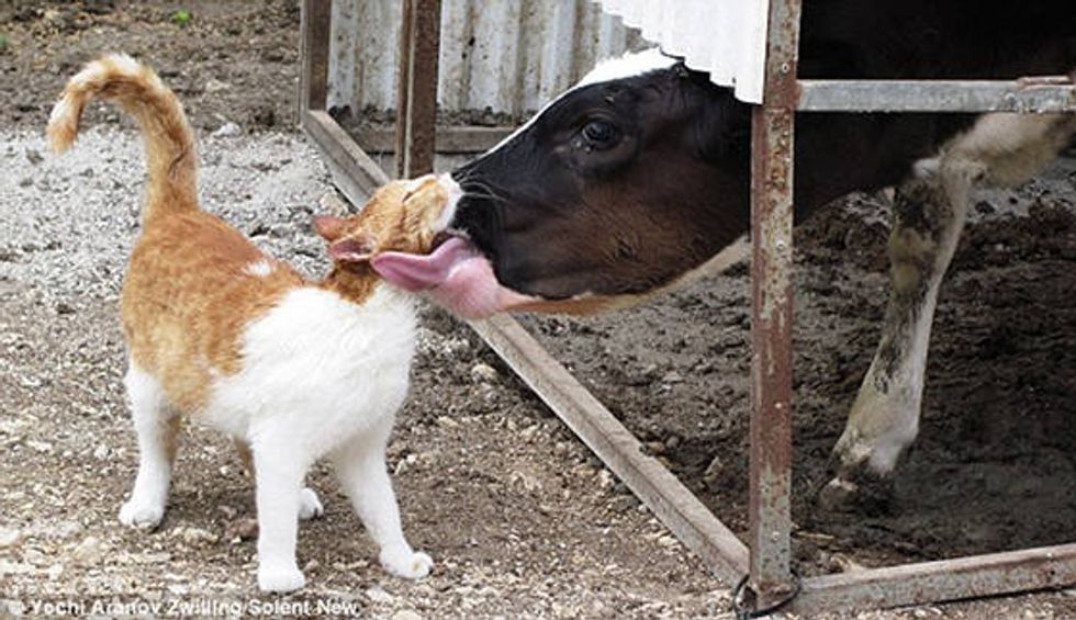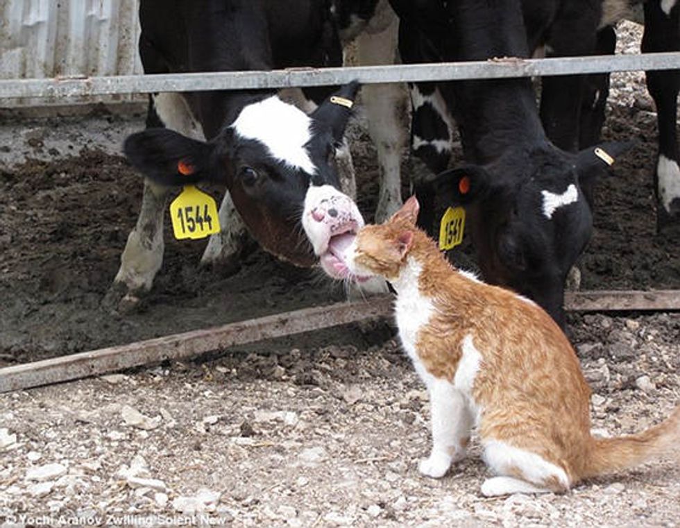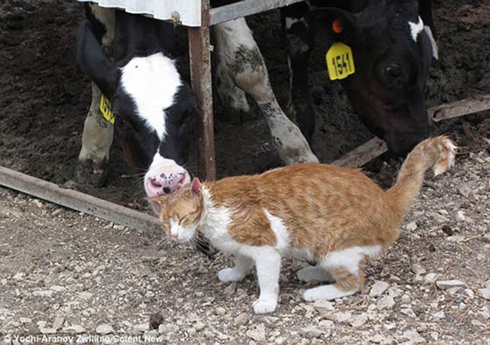 A stray ginger and white cat visits his unlikely friend, a cow, every day on a dairy farm in Isreal. Sometimes when he comes over, the cow welcomes him with a slobbering kiss.