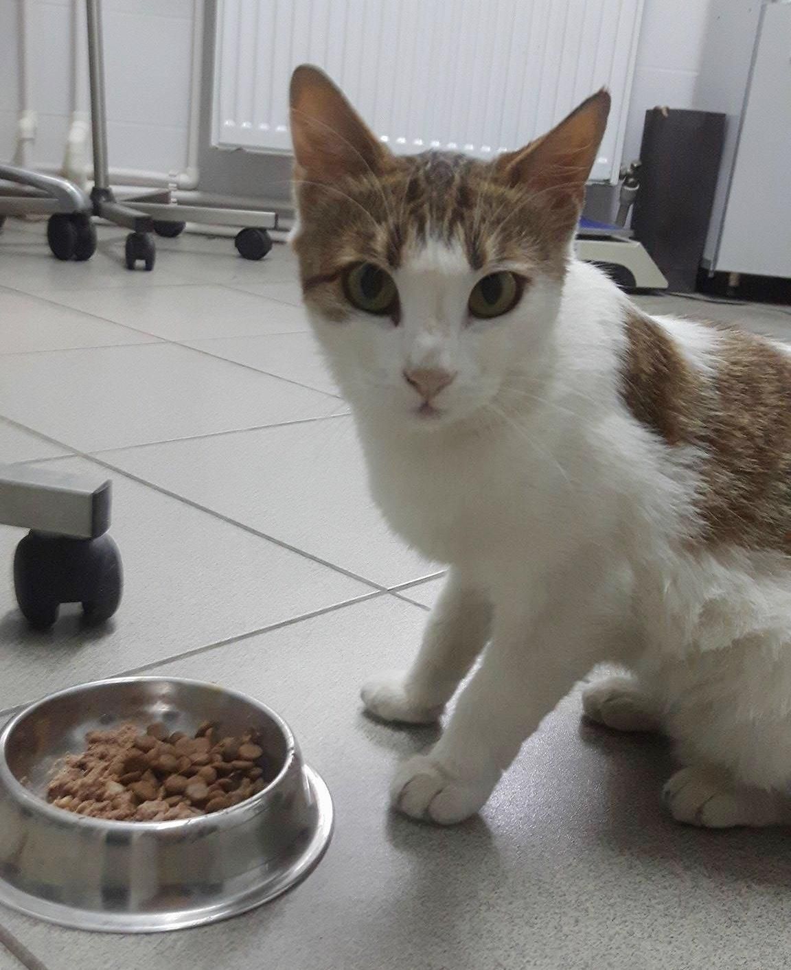 The kitty was just skin and bones, covered in filth. Her tail was missing and she was in bad shape. Theo took her in and brought her back to health.