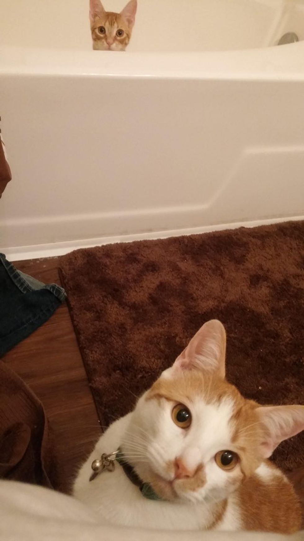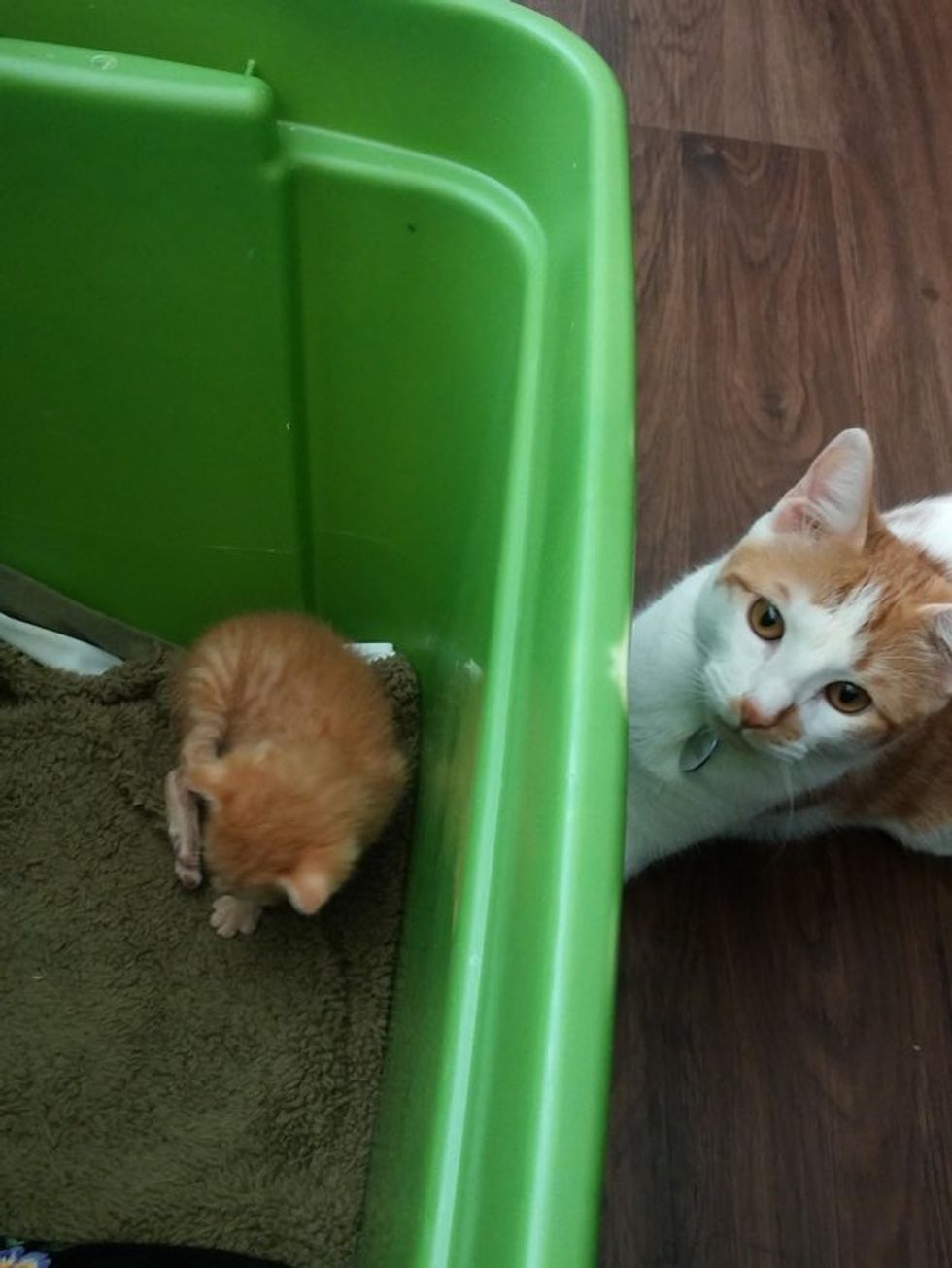 Parker the cat sat there by the box, keeping his adopted brother, Simba, company.