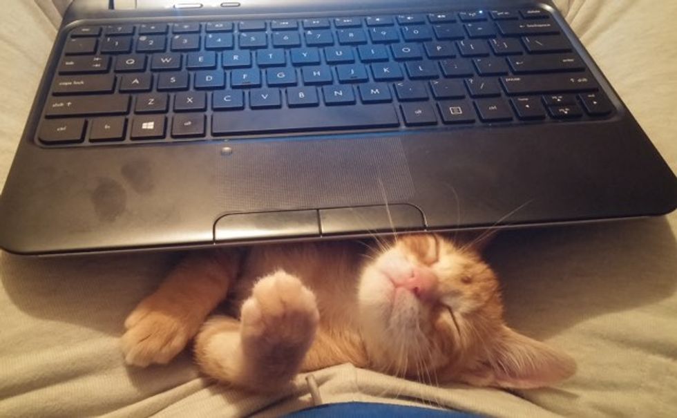 3 months after the rescue, Simba snuggled under the laptop for a nap while his human was on the computer.