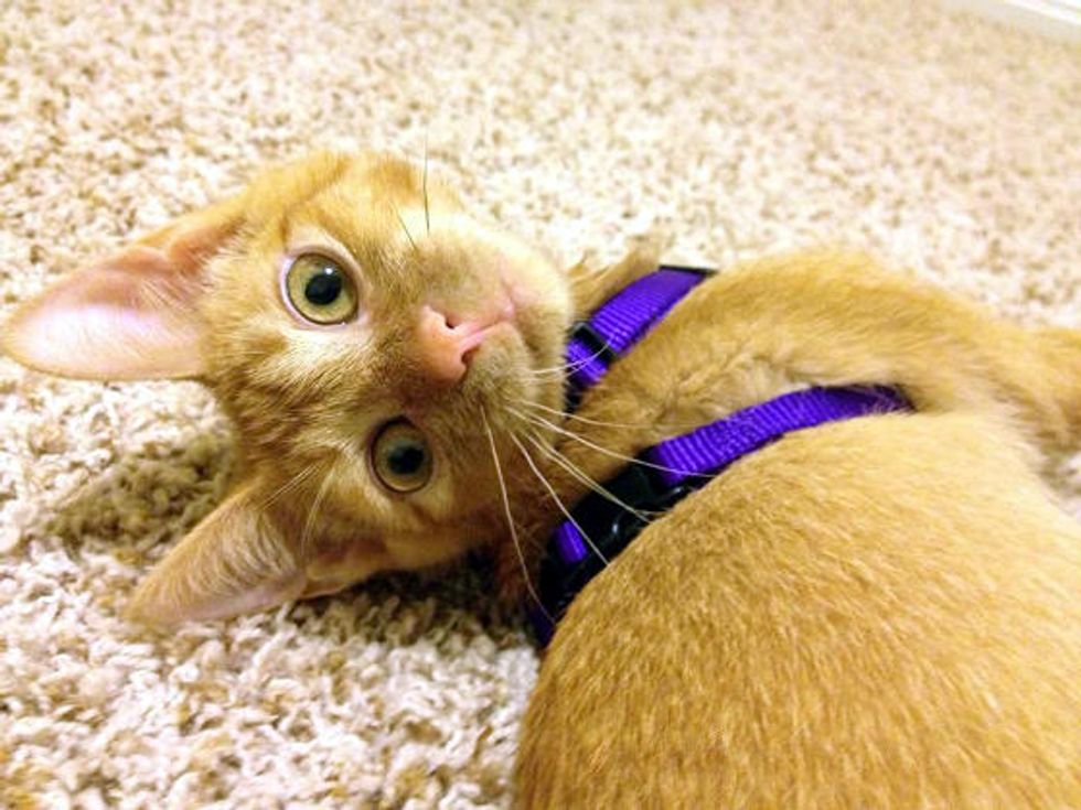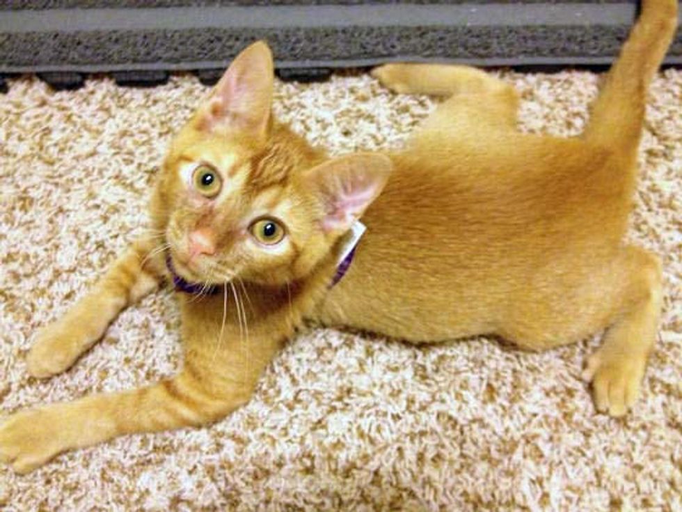 Triton is a very laid back kitty who loves to practice his walking with his foster parent. "[His] disability doesn't hinder him from much activity. He can still get around, play normal, can use the litter box and eats on his own. Triton is just like any other kitten." He is abled in a different way: to touch people's heart with his will to live life to the fullest despite all odds. Now all he needs is a forever loving home.