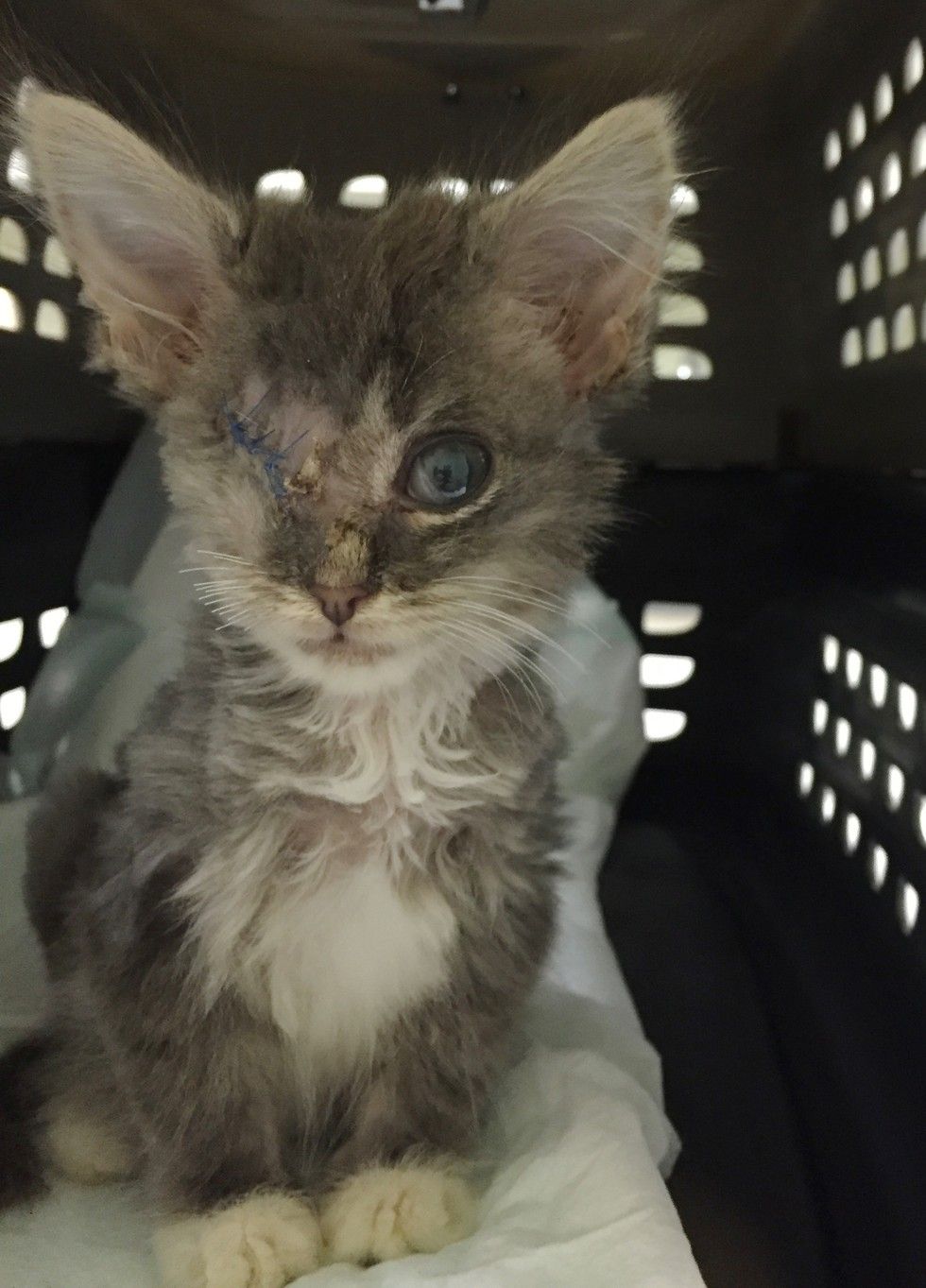 PeekaBoo the tiny gray kitten was found in poor shape at just 3 weeks old. She was malnourished and had a severely infected eye, which was removed to save her life. The little fur buddy is grateful to be on the mend.