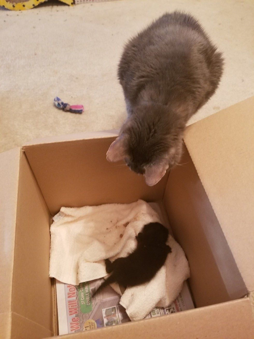 Sandi quickly fashioned a makeshift nursery bin with a cardboard box and a towel and rushed to the store to get some kitten formula so the little fur baby could start feeding.