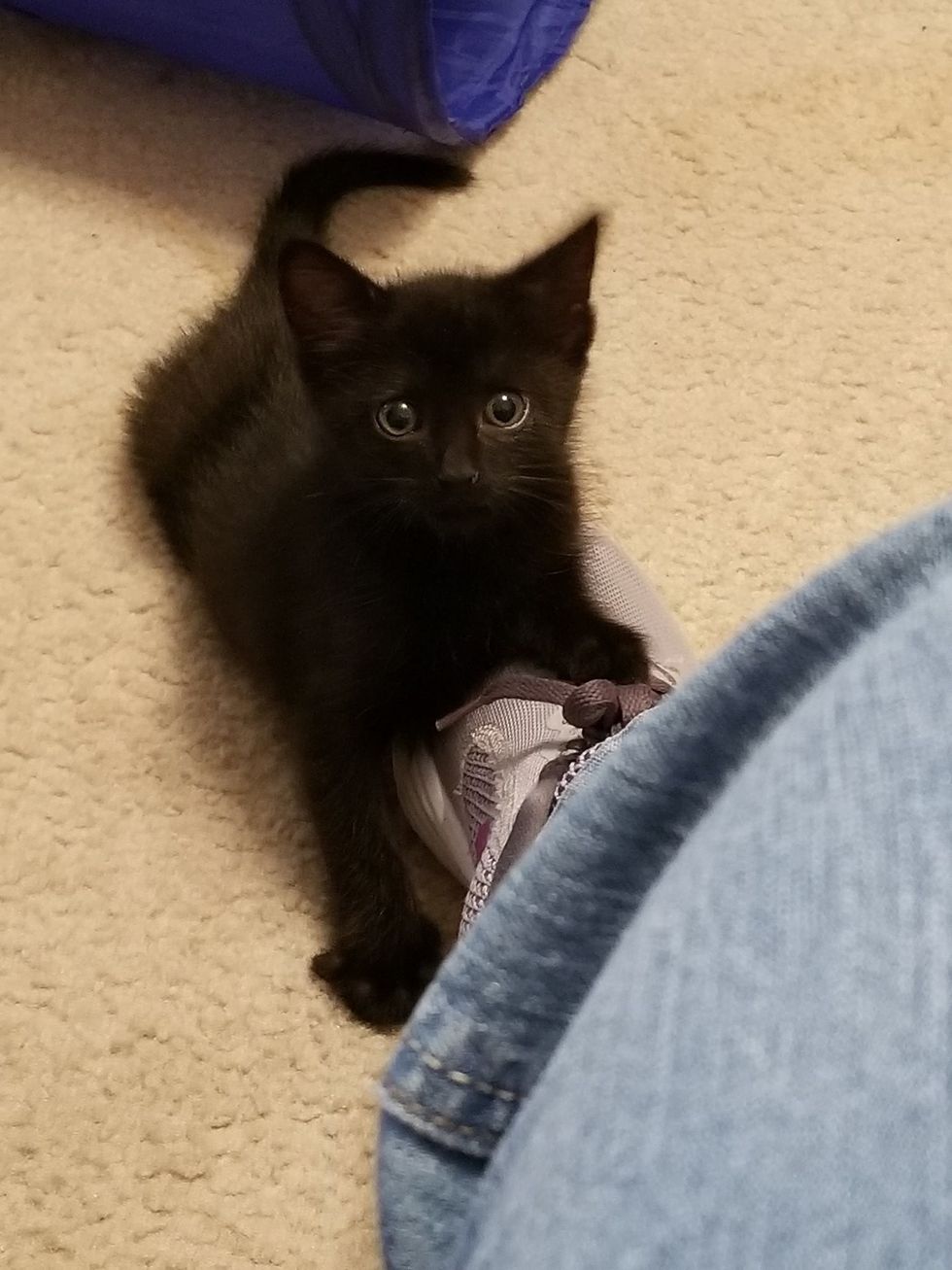 The kitten quickly took a liking to his human mom's shoes especially those with laces.