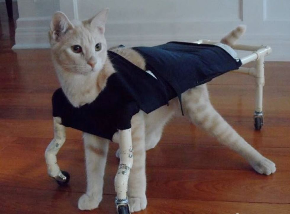Budd born with Cerebellar Hypoplasia was found at eight weeks old and brought to Cat Depot, a rescue center in Sarasota, Florida. His foster caregivers Jill, Kay and Jim helped him build muscle strength to walk in a custom made cart. They taught him how to eat from a bowl and use a litterbox on his own.