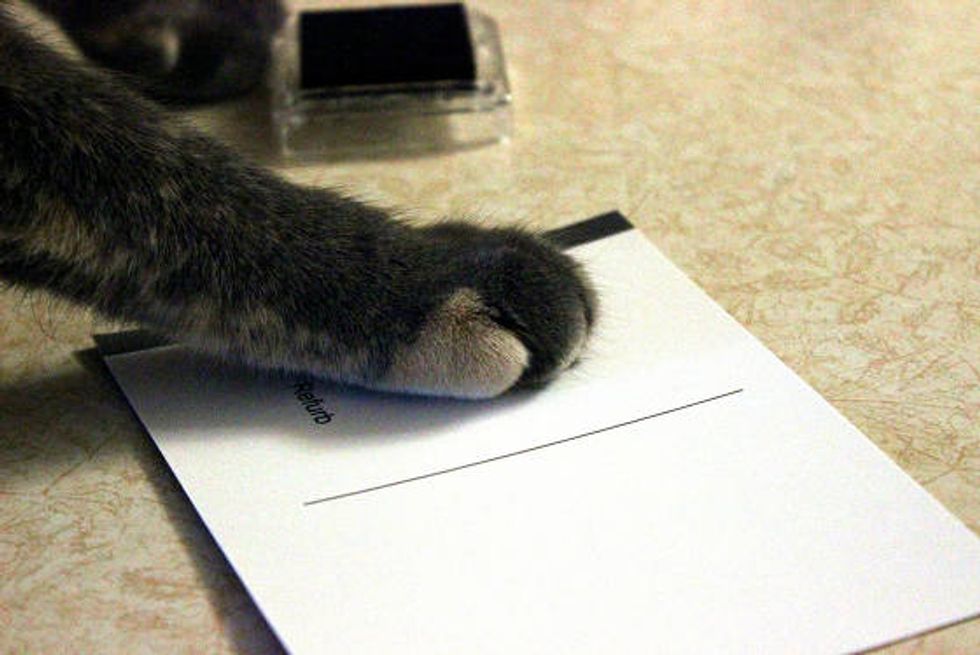 "Now I have to mail dozens of these out. To strangers. From the internet. This is by a wide margin the silliest thing that I have ever done, and yet I don't feel that silly about having helped out some animals that need it. However, I will feel silly when I go to the post office with a postcard of my cat's paw print, asking for postage to Australia."