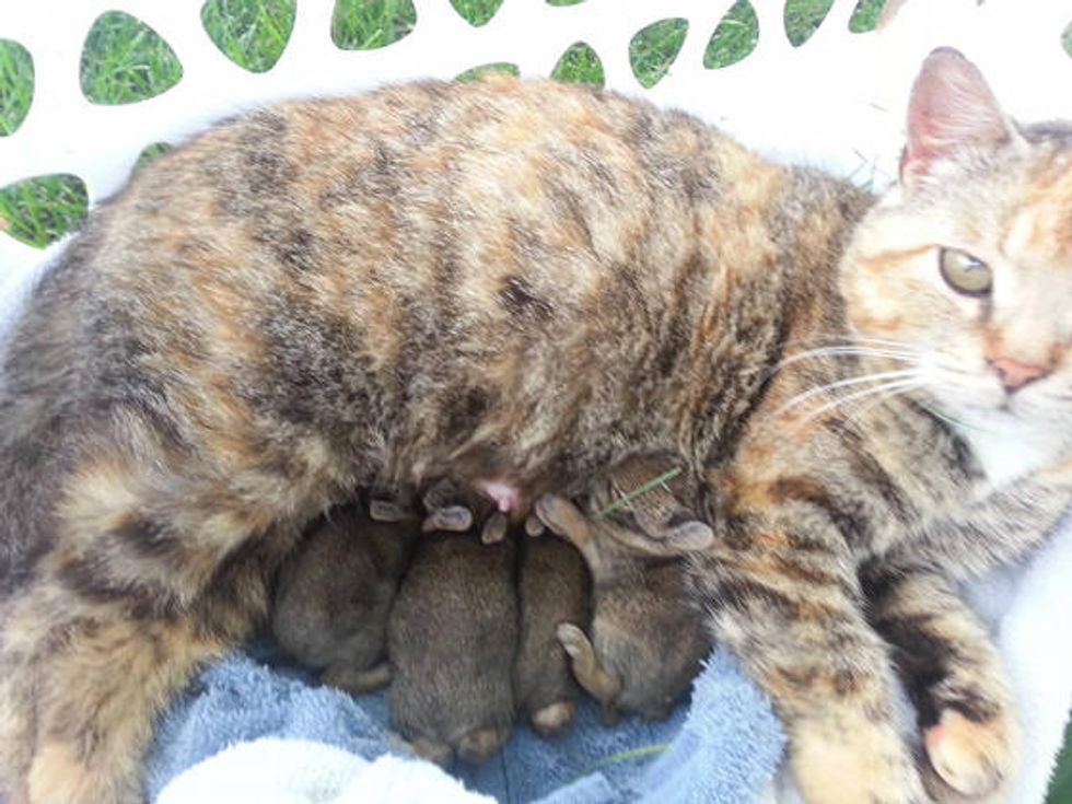 A cat adopted a litter of baby rabbits she found in the yard, and started nursing them as her own.