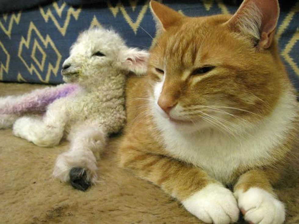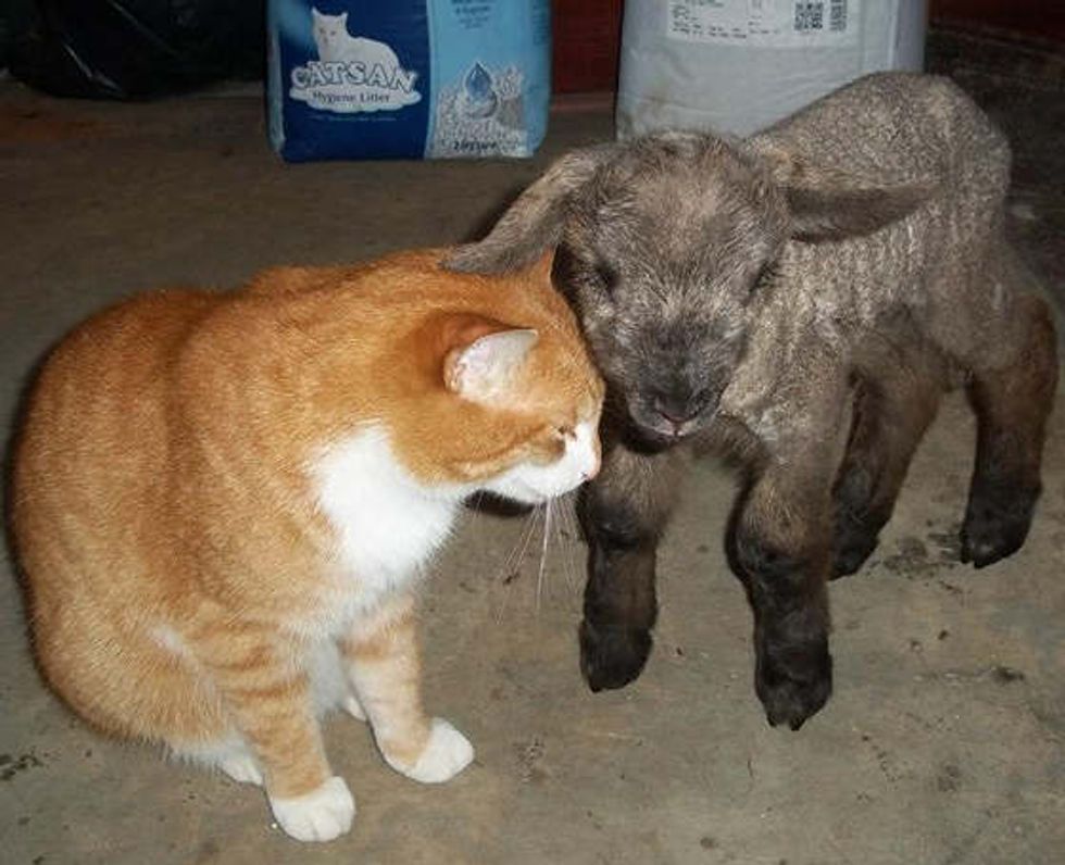"Sox is a pretty big cat, but this lamb was the smallest we've had. He was one of triplets and wasn't expected to survive. He lived in the sitting room for the first month of his life. After Sox adopted him, he became party of the family, he's out in the field as we speak," kezzymac of reddit wrote.