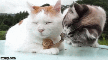This very chill looking cat has many unusual pets. He's introducing his buddy to one of his pets, a snail. They start their meeting with a few gentle loving nuzzles...