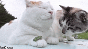 Besides snails, the chill cat also has a pet frog.