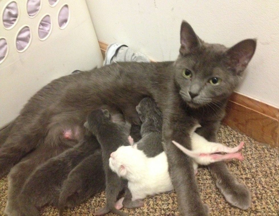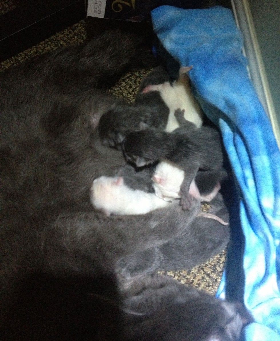 He decided to take the kitty to the vet when he found someone to adopt her, only to find out that she had several adorable little 'nuggets' inside her belly. "I decided I would help her out and let her live rent free in my house, and on Tuesday she did the thing!"
