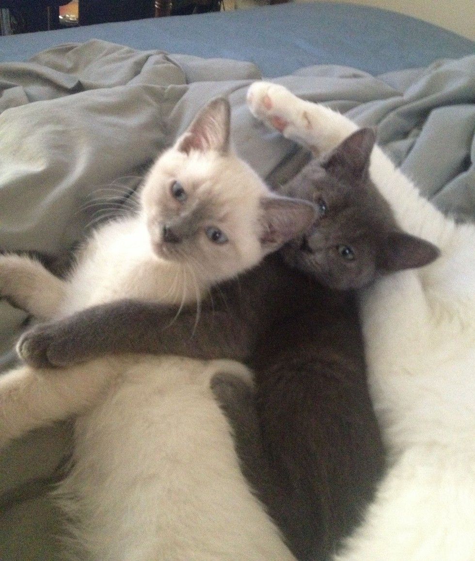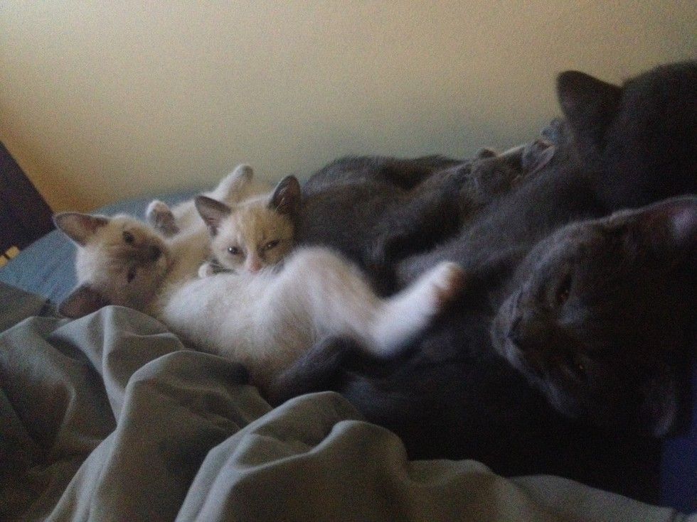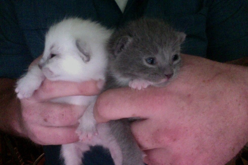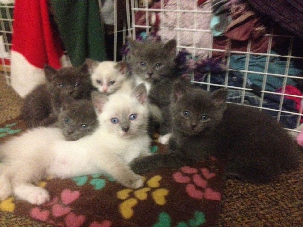 There are four grey babies and two Siamese mix kittens. At just a couple days old, they still couldn't see.
