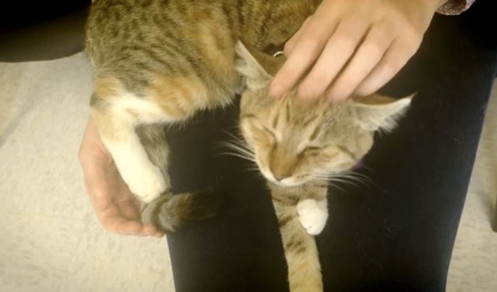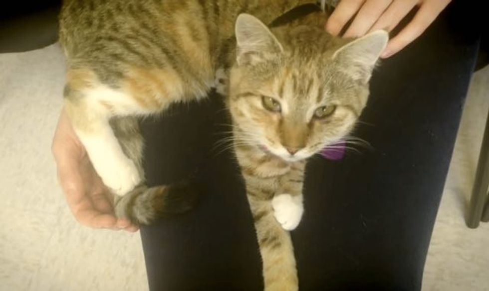 "Our entire office has taken her in and we all take care of her and she loves every single one of us in the office equally. She spends her day visiting each of us and greets all visitors with her loud purr and her gentle face. The families that visit our office love her too."