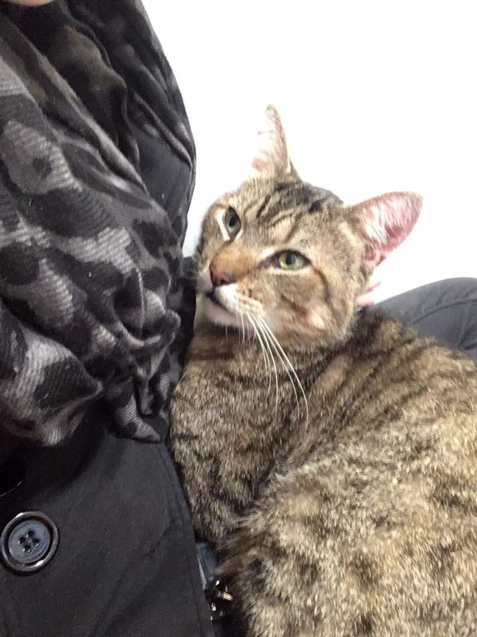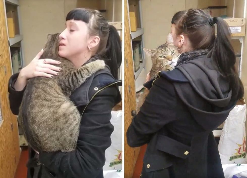 As cat lovers, they couldn't go without giving the kitty some love and cuddles. As soon as Jessica took the kitty out of his condo, the big tabby boy wrapped his arms around her and burrowed his face in her shoulder.
