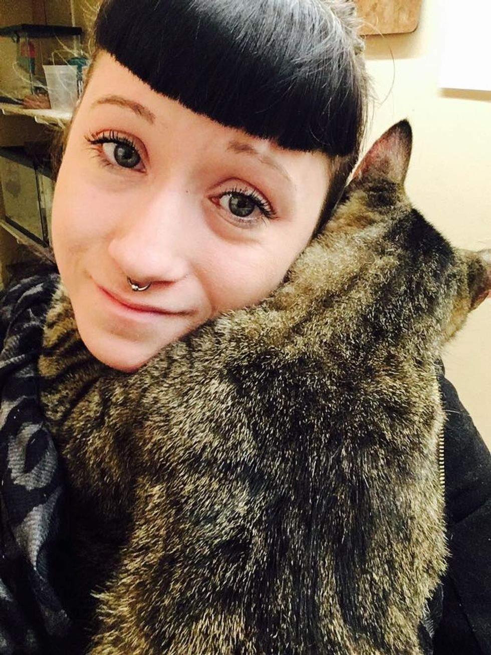 One of the cats decided to clutch onto the young woman and wouldn't let her go.