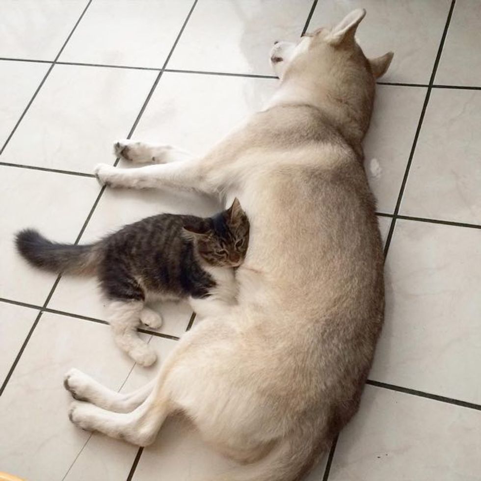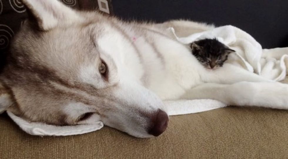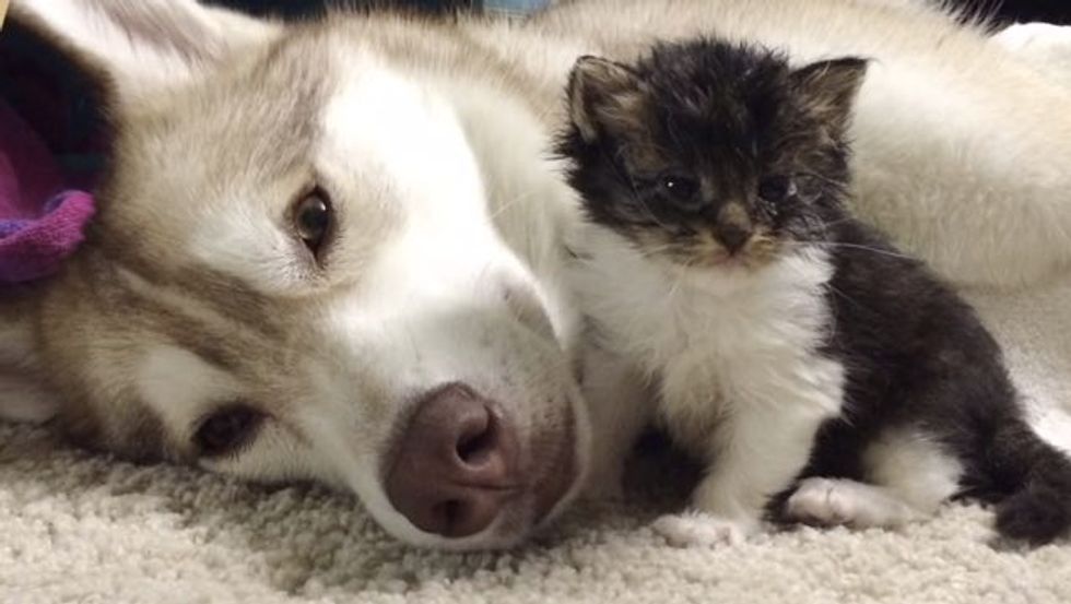 Rosie a little rescue kitten was adopted by Lilo the Siberian husky when she came to her foster home as a sickly kitten. They weren't sure if she would be able to make it but Lilo took her in and saved her life.