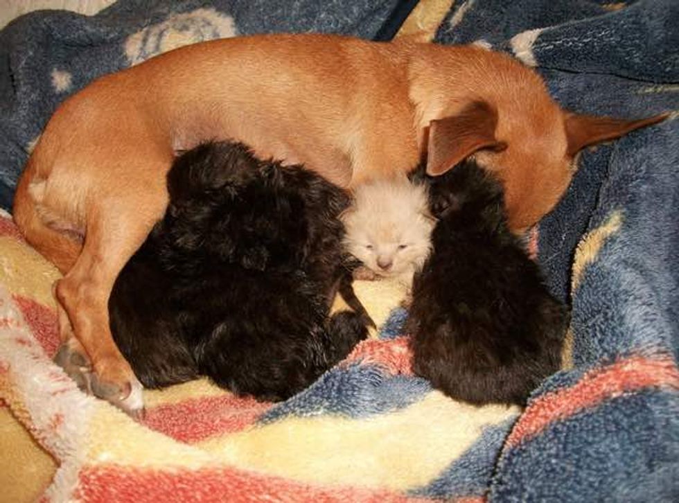 A dog mom lost her only puppy and was saddened by the tragedy, but she turned around when five orphan kittens came to her, meowing for some very needed motherly love.