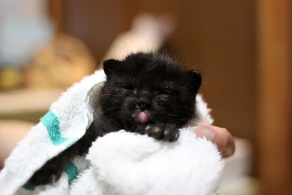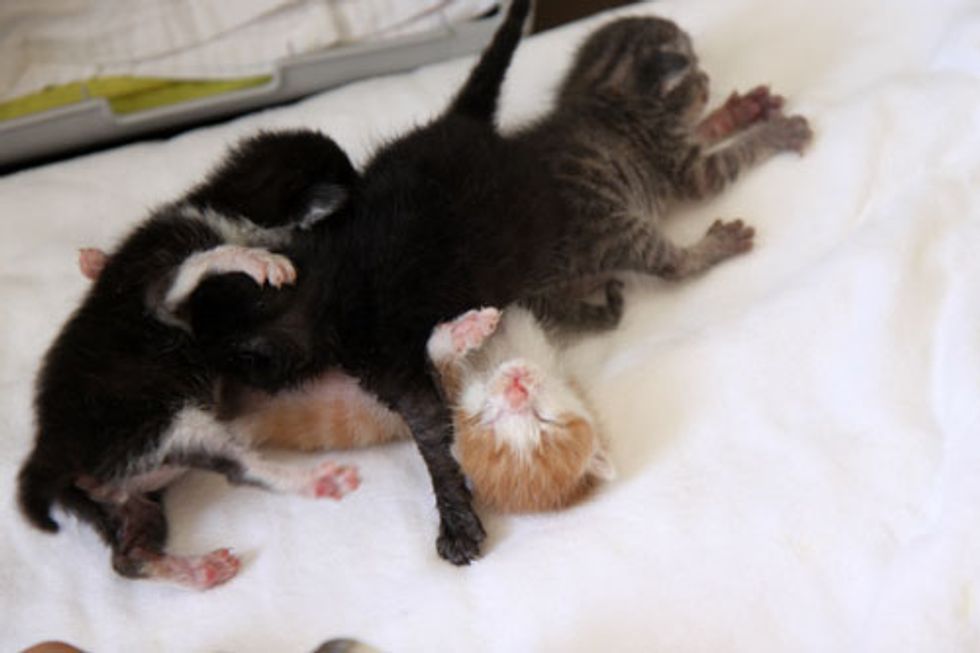 Chobi (Nao-chan) immediately took them home and put them in a large towel to keep them warm. She prepared kitten formula and fed each single of them. The babies gulped down the food and started purring like motors. The black kitten named Hikaru was the largest of all. The little tuxedo is Asashi. The ginger and white baby is Kirara. The tiny tabby is Ibuki.