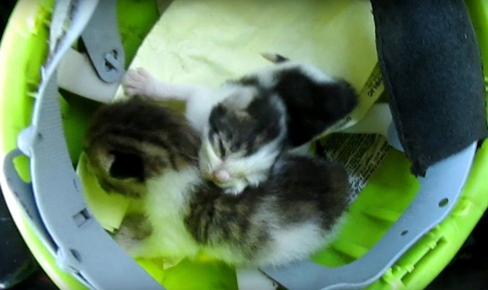 He placed the kittens in his helmet and drove them to an adoption drive, hoping the people there could help, but he was told that "anything under two pounds will be euthanized."