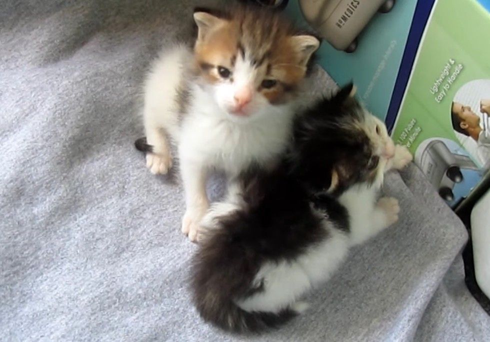 He first kept the kittens in the pile, hoping the mother would return. "I came back several hours later… the two guys were still sitting there, looking confused, so I went ahead and picked them up. I didn't want to leave them there."