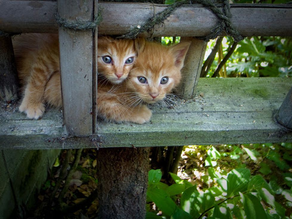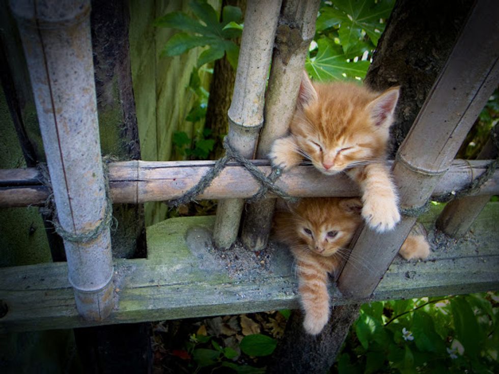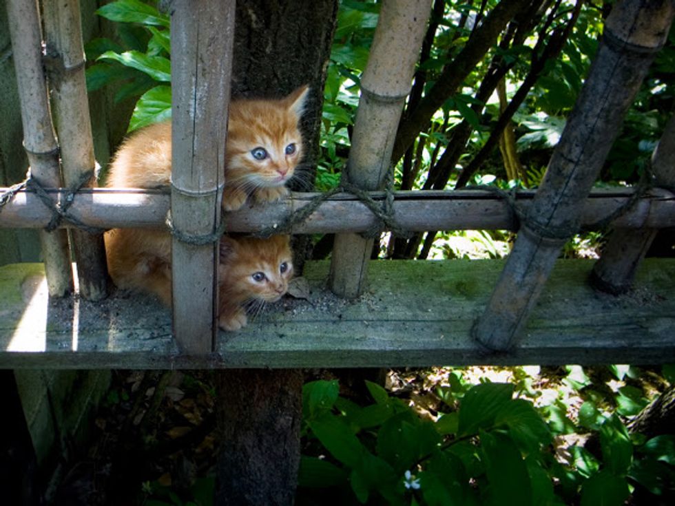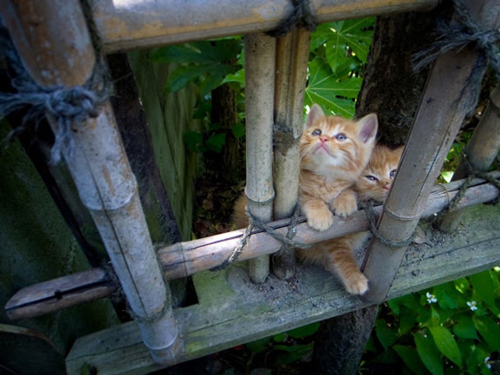 Two mischievous kittens are hanging out near the Philosopher's Path where people often come to meditate in Kyoto, Japan. They are having so much fun climbing on the scaffold-like structure and playing with each other.Their lovely antics are adding a lot of joy to this tranquil place.