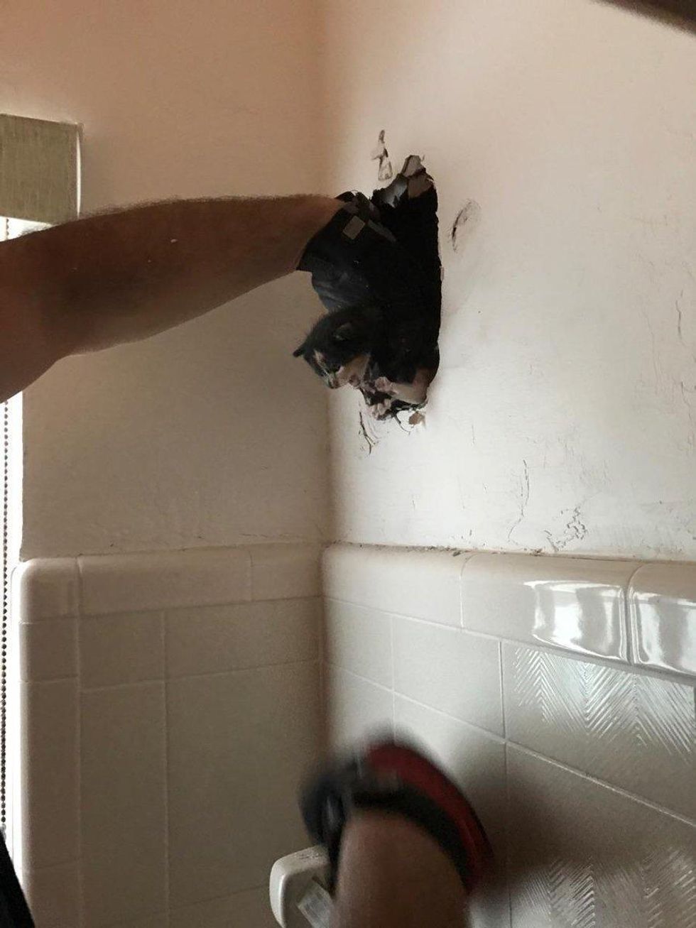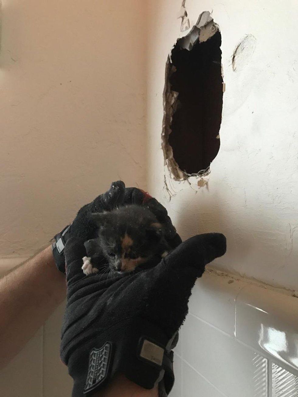 In Fort Lauderdale, Florida, a family was going about their day when they heard a faint meow inside their house. They couldn't see any kittens anywhere, but the meowing just kept going. Soon they realized that there was a kitten trapped inside the wall and called the Fort Lauderdale Fire Rescue for help.