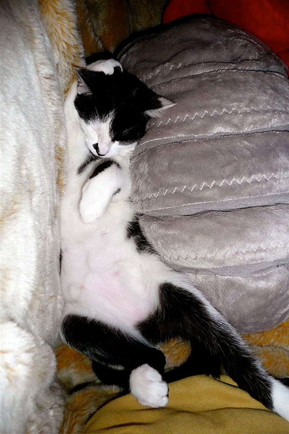 Kiko stayed separately from the other three cats before she was fully integrated into the kitty tribe. When she was not playing with Lori's hands which were her favorite "toys", she tried to catch her own tail and wrestle with it. Lori got her many toys, but Kiko started ripping them apart with her teeth.