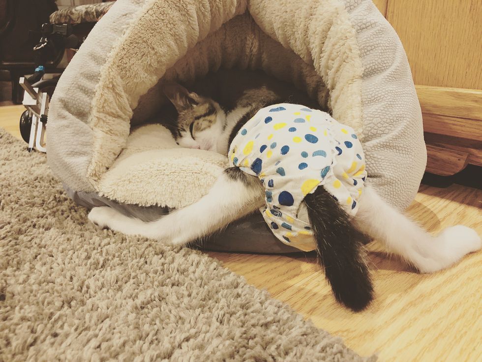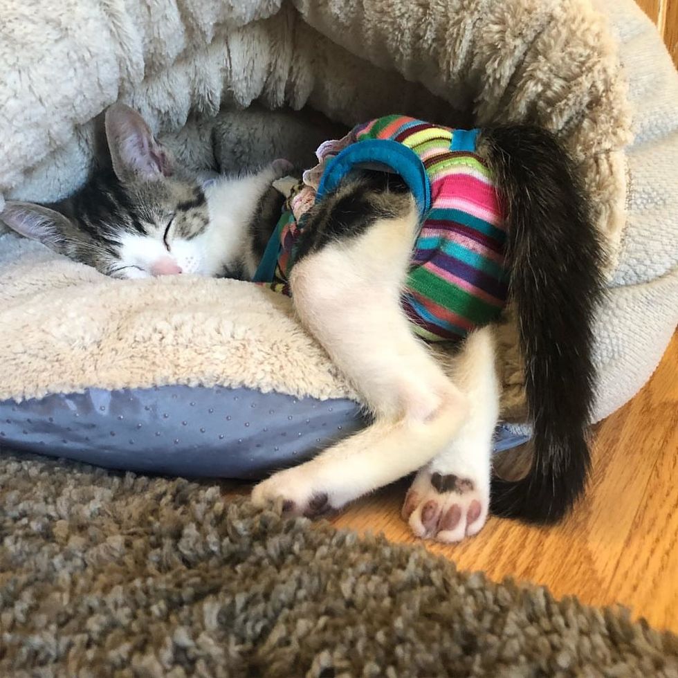 Each day, his legs got a bit stronger and he went a bit faster. When he was done with his daily exercise, he would crash in his kitty bed for a cat nap.