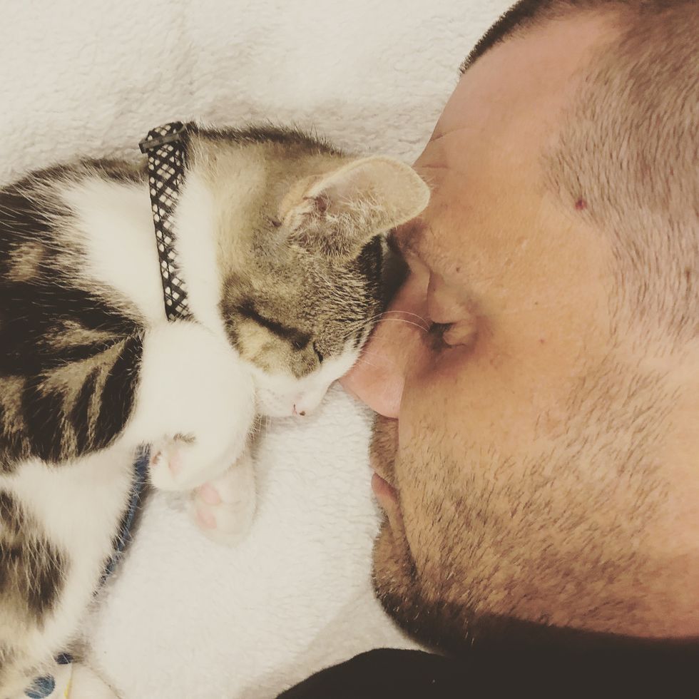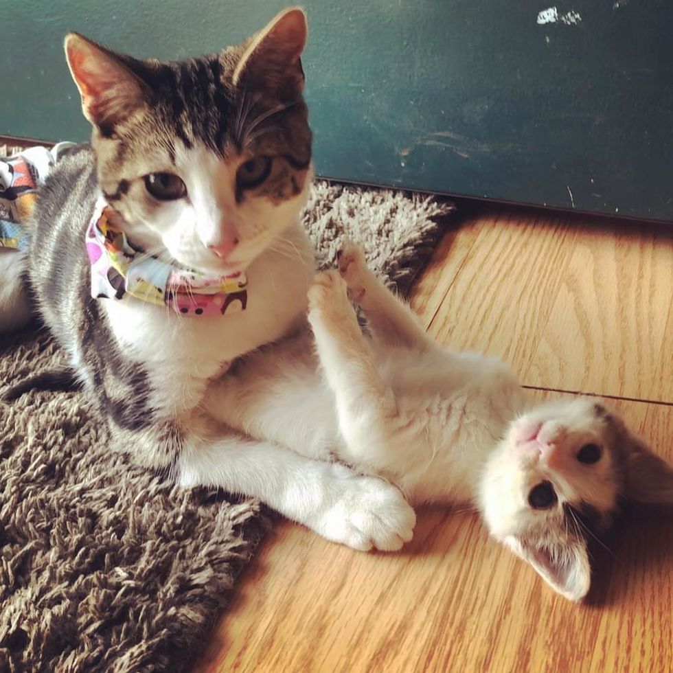 Rocky is giving his foster kittens the same love he received when he was rescued.