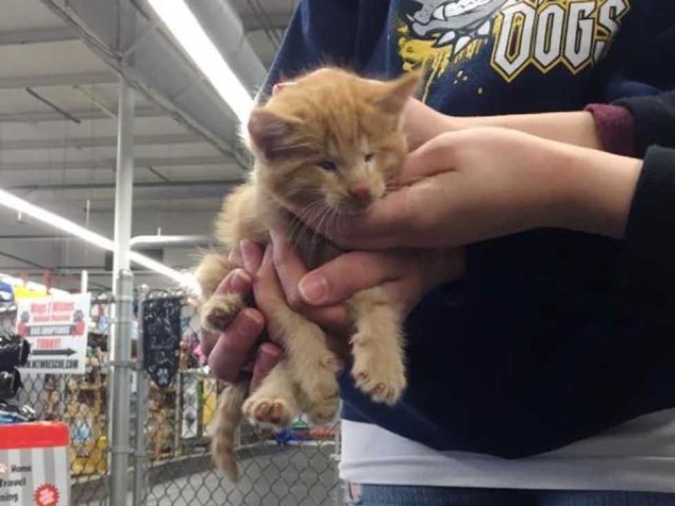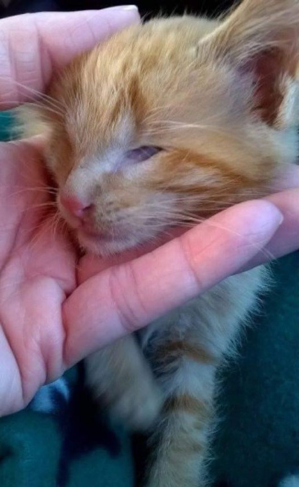 When this tiny kitten was found in a family's yard, they thought she was very young and hadn't opened her eyes, but when the rescuers took her in, they realized the little ginger girl was born without eyes.
