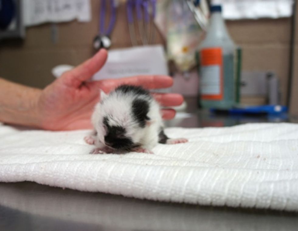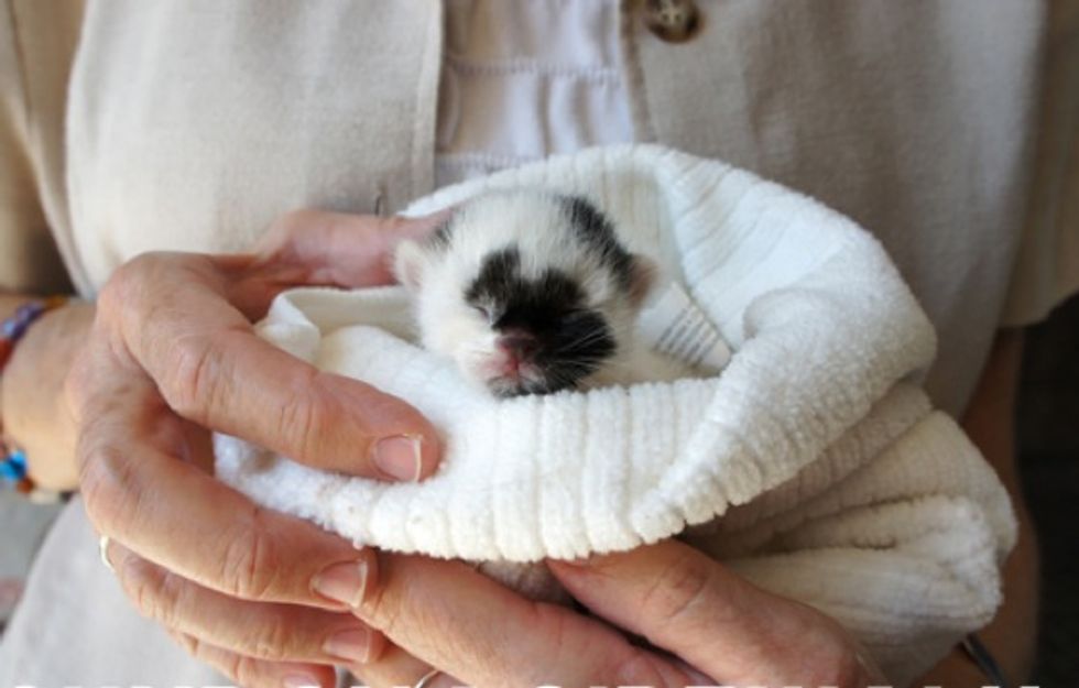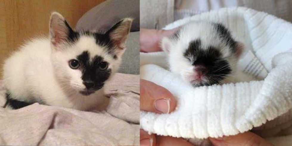 A tiny spotted baby kitten was found curled alone on the sidewalk by a good Samaritan. "The woman gently scooped the kitten in her hands and rushed it to a veterinarian who fed him and found out that this little spotted kitten, who looked like a panda bear, was only one-week-old," said Helen Woodward Animal Center.