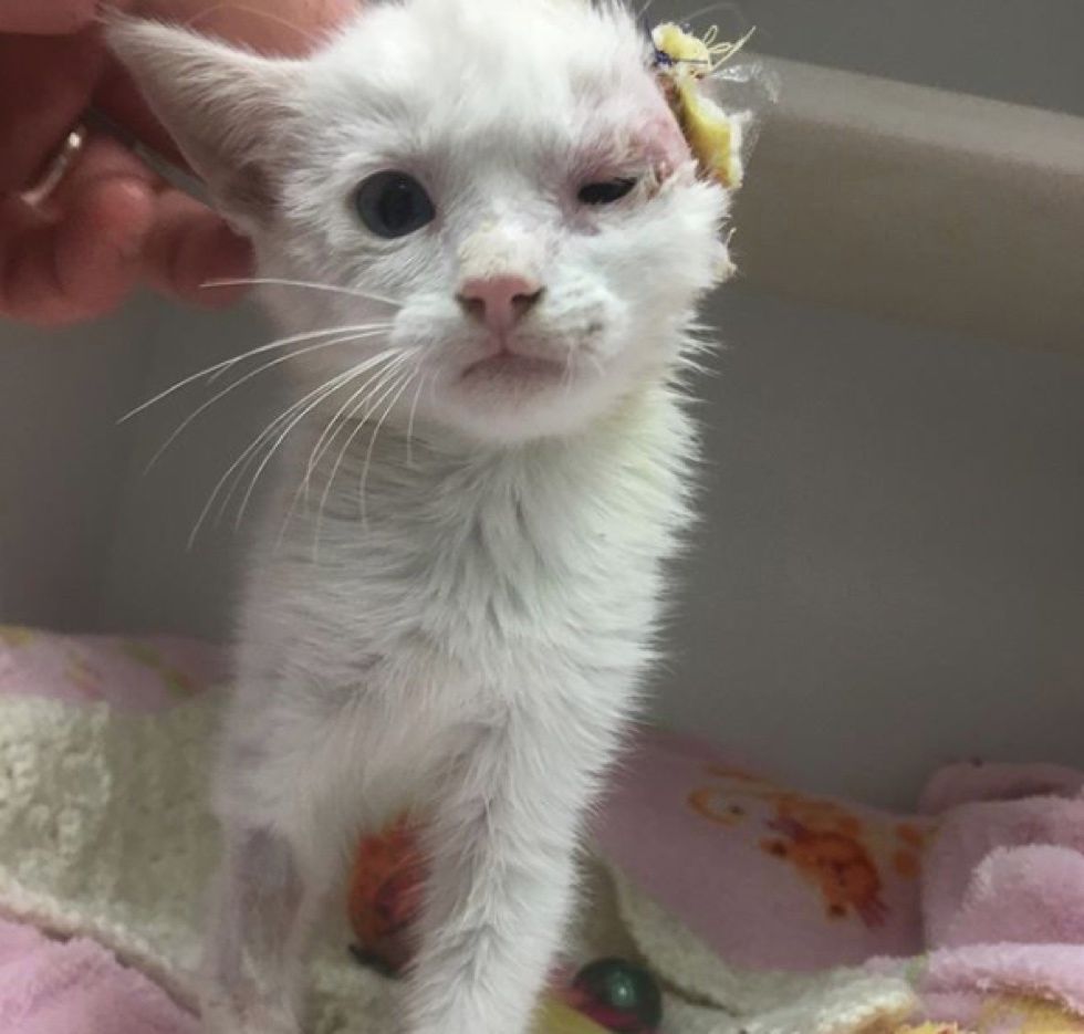 The kitten was found with her ear dangling from her head by a thread. She took refuge under a car when she saw people coming to the parking lot. "My boyfriend and I brought her water and food to see if she'd come out," Clarissa told Love Meow.