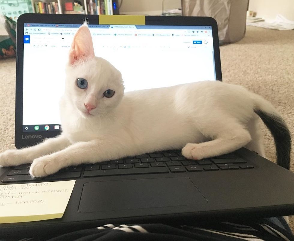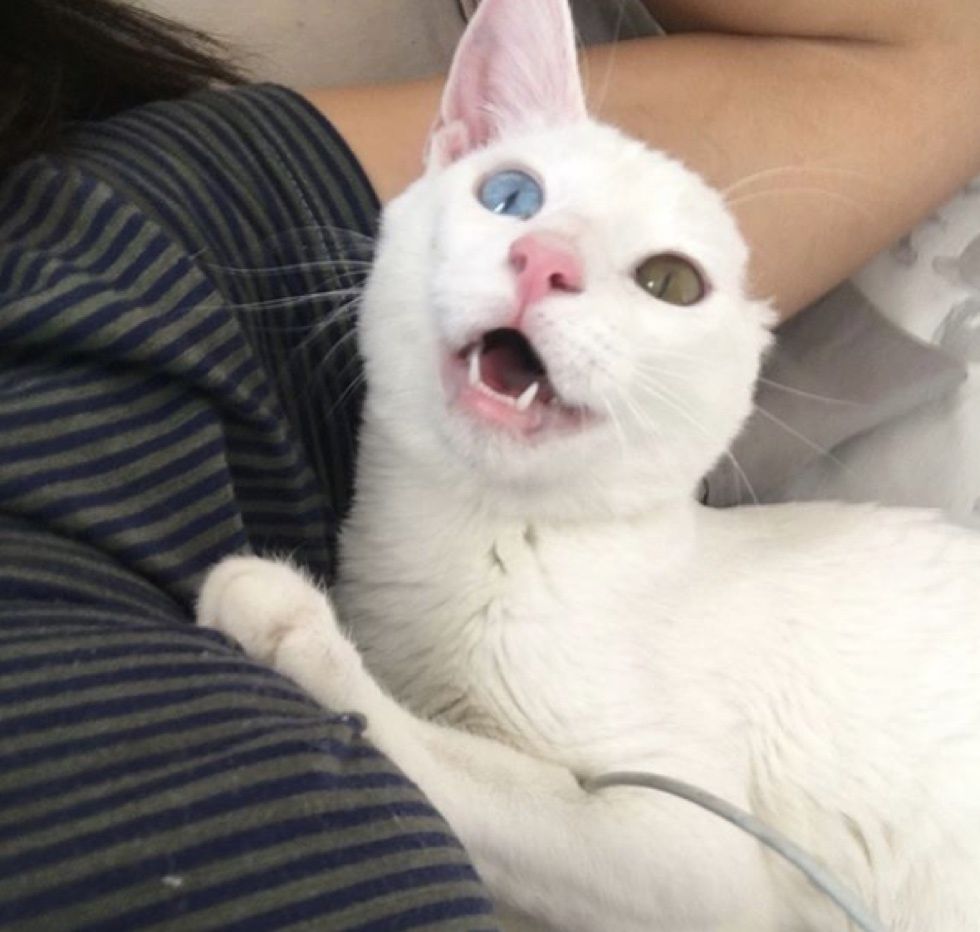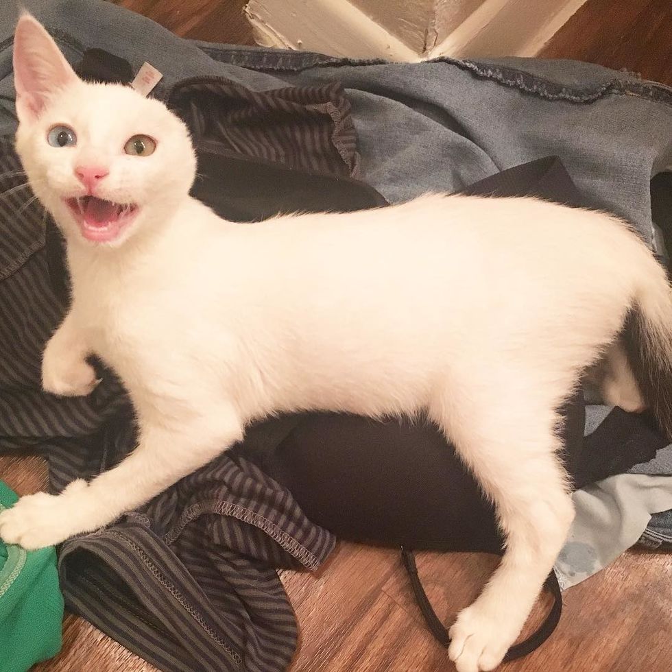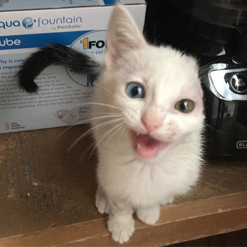 The little one-eared wonder has grown into a gorgeous cat with two different colored eyes (heterochromia iridum) and a larger-than-life personality.