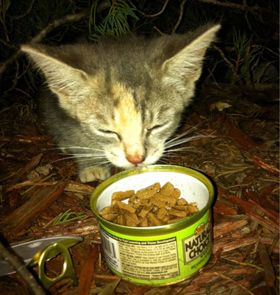 Abbi wrote: "I came back and put the food down but she was still too scared to go near it with me, and that night I couldn’t get her to come home with me. That was hard. I came back first thing the next day with more food and same deal leave the food and go faaaaar off into the distance. I did this day and night for a week. She got better and I could stand closer but even if I reached down to touch her she’d hiss and run away. One night I couldn’t even find her and had to just leave the food. I was so scared that something had happened to her, but the next morning there she was waiting for me."