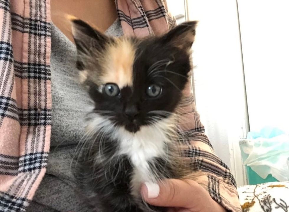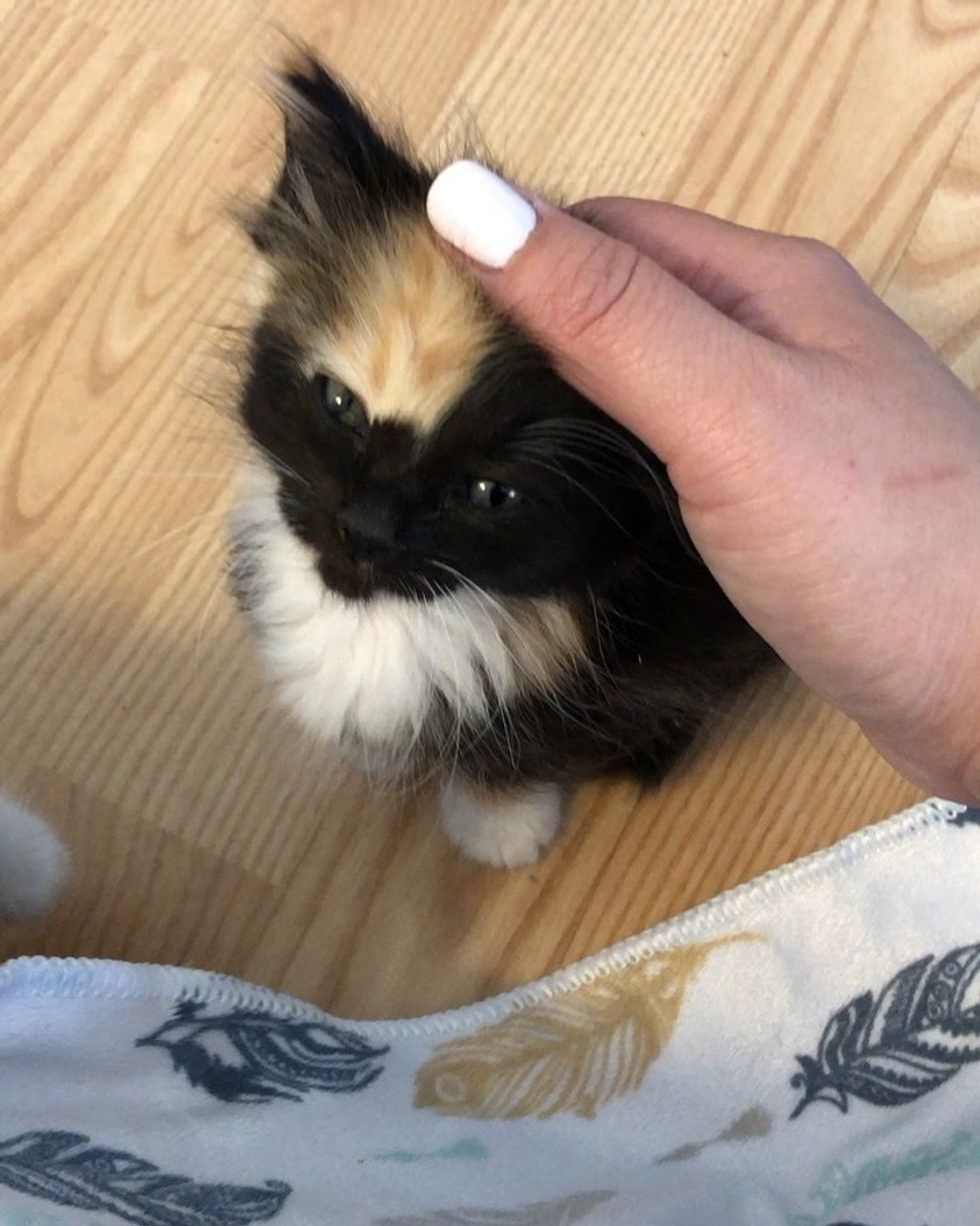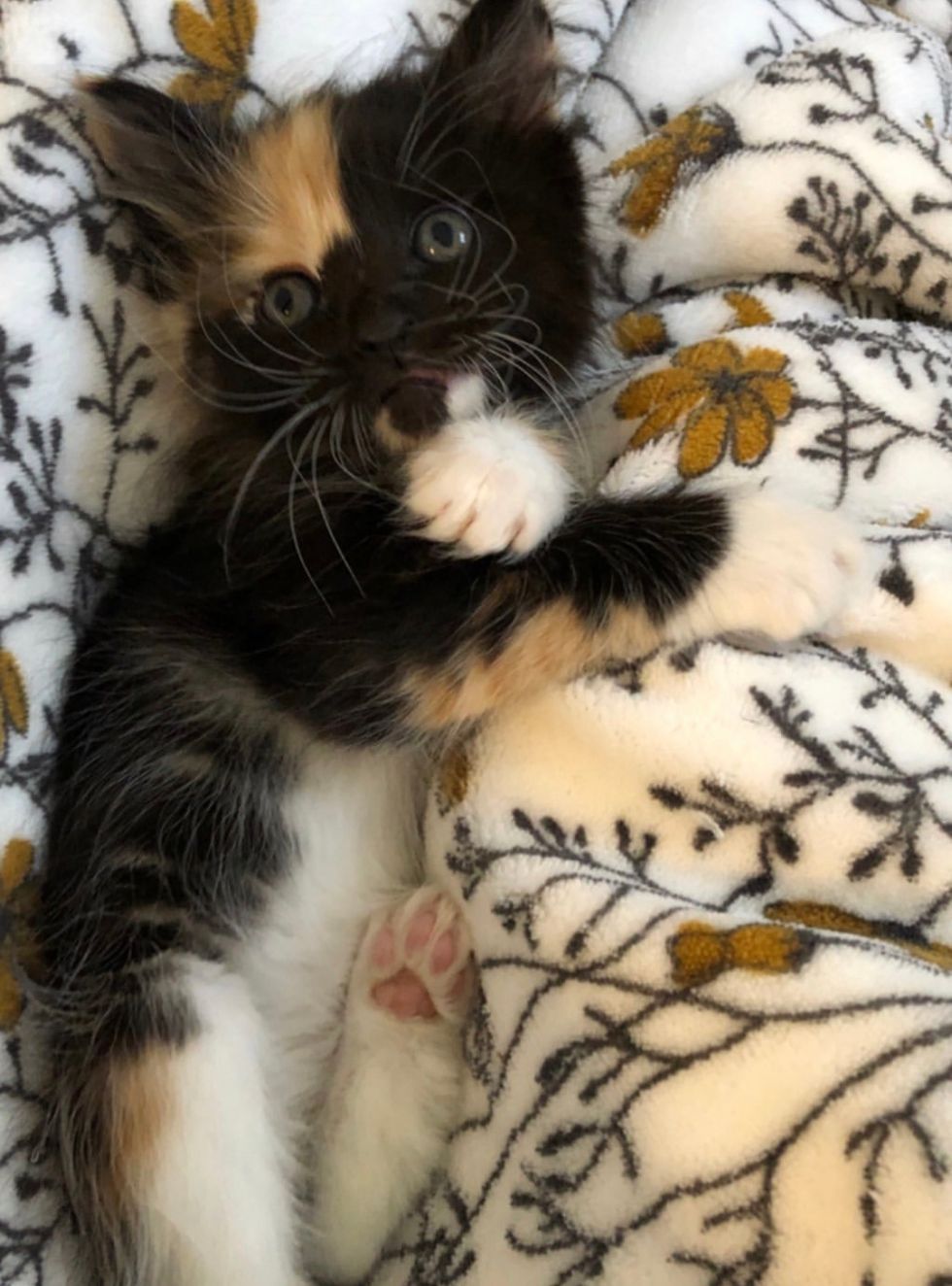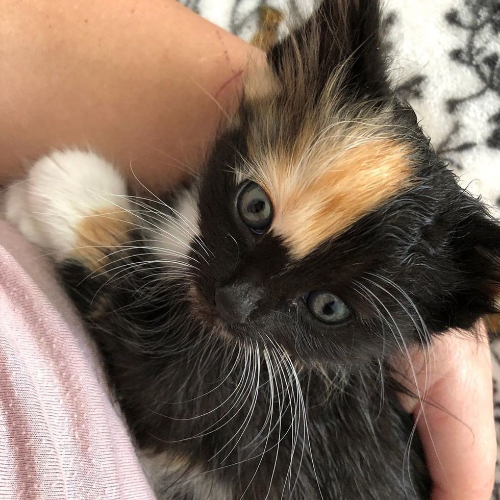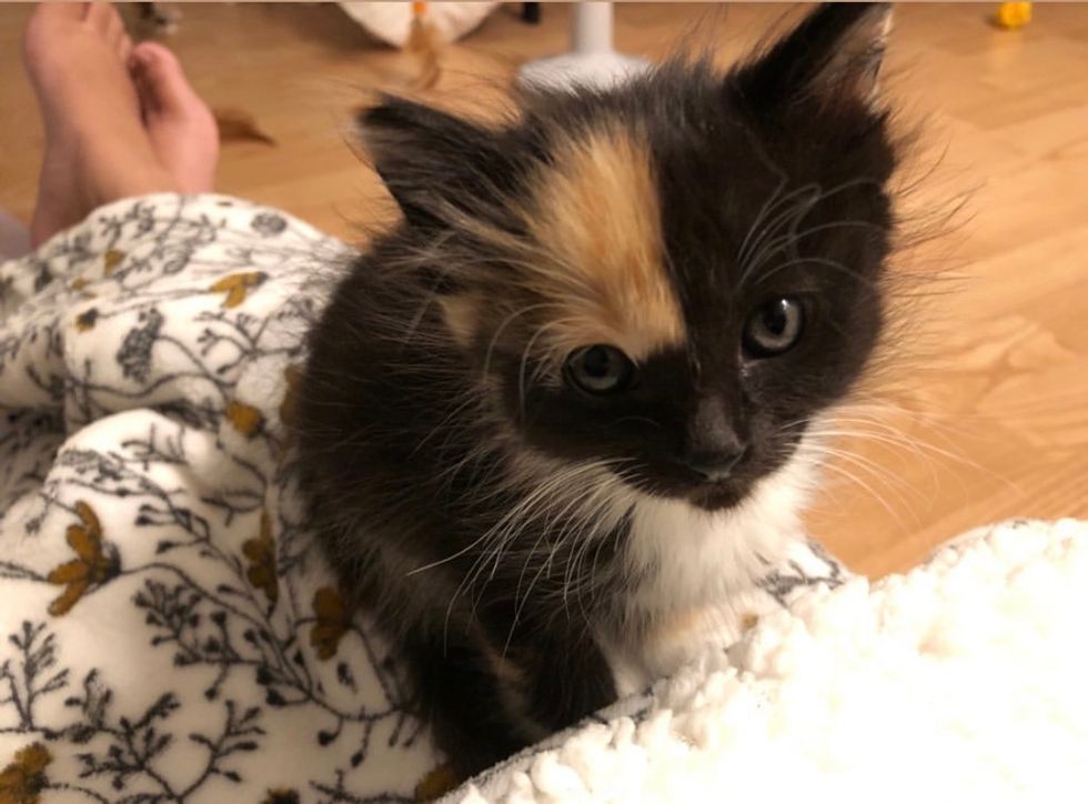 A little tortie kitten discovered her love for laps and couldn't stop cuddling.