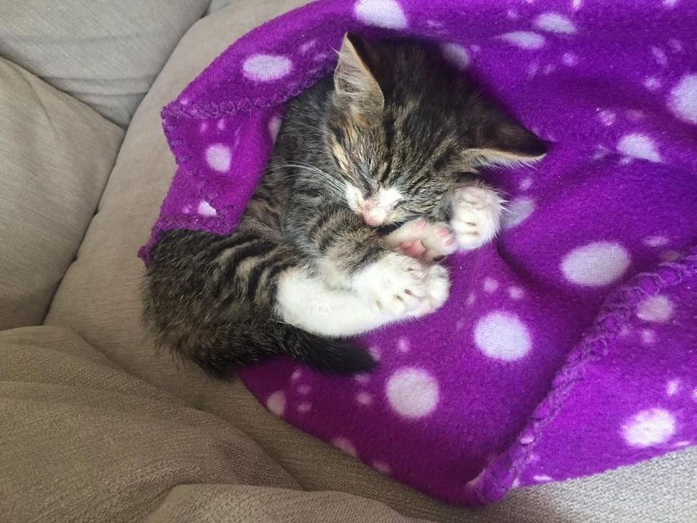 Knowing that the kitten needed help, Jodie took her to work with her and spent all morning warming her up. At lunch time, she brought the kitten to a veterinary clinic to get her checked out. The tabby weighed just 340 grams and the prognosis was not good.