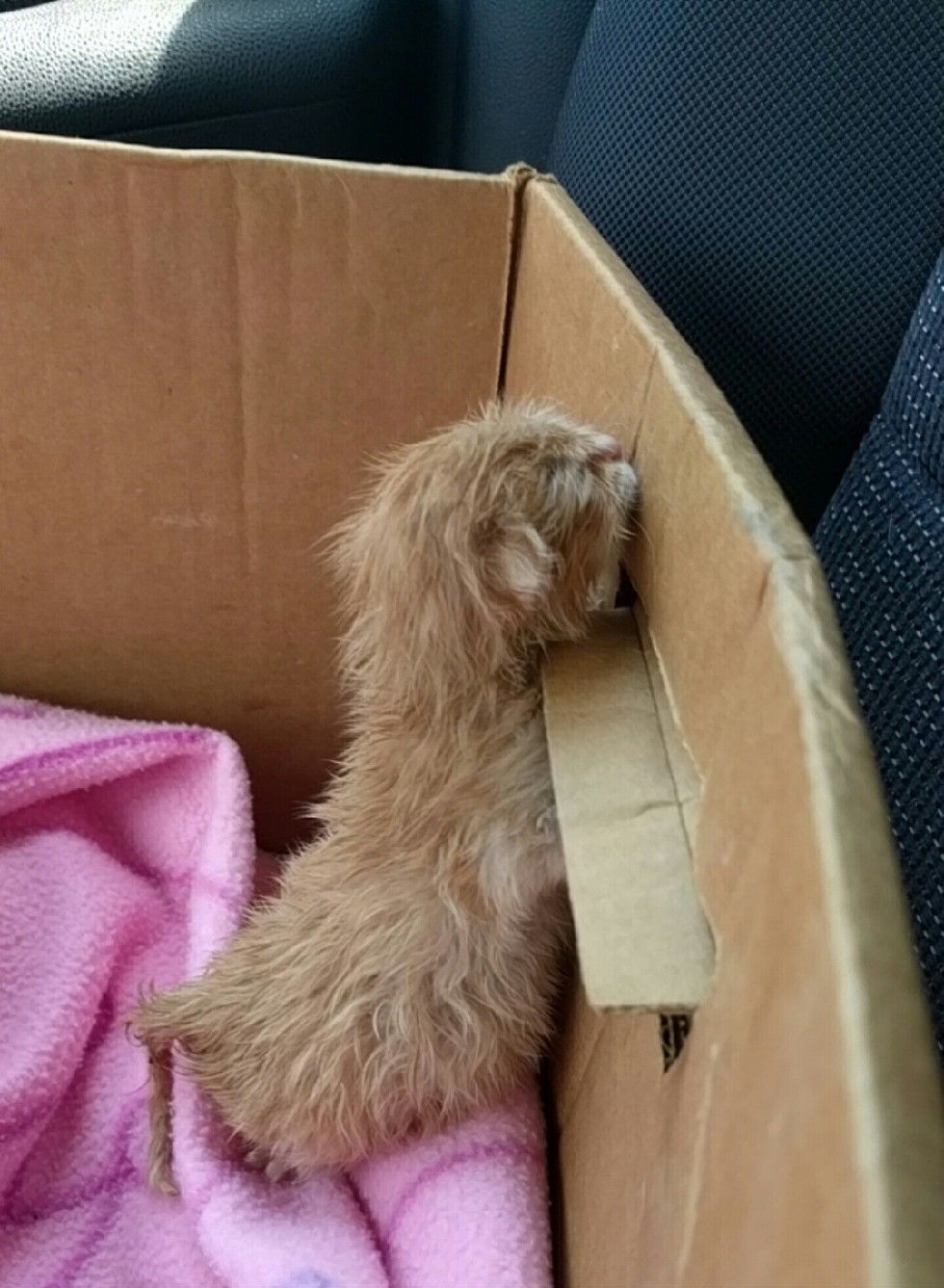 A good Samaritan heard a tiny kitten squeaking away outside. Upon investigation, they found a litter of four kittens, but only one survived. It was that little kitten's meow that led them to him. There was so much fight in this tiny fur ball that barely weighed anything.
