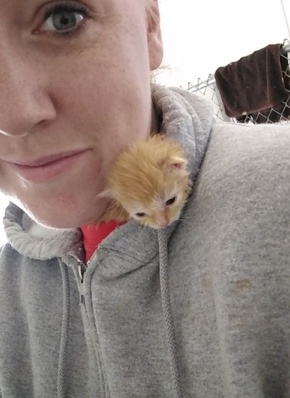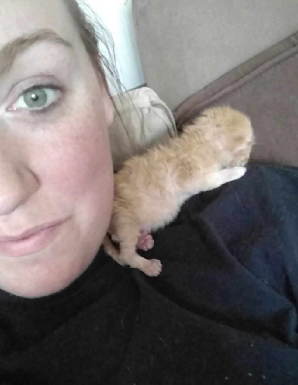 It's warm and cozy. Little ginger loves snuggling with his foster mom wherever she goes.