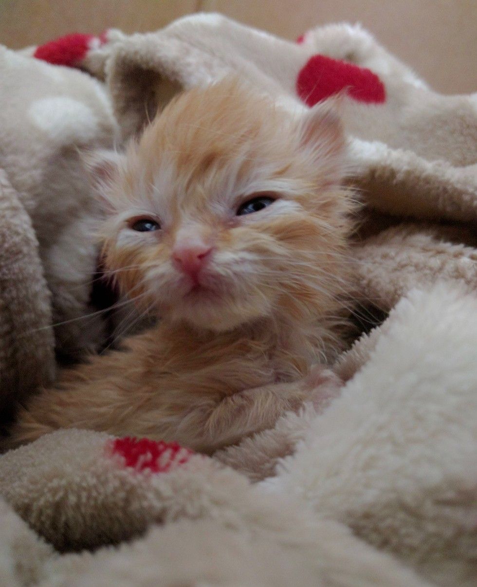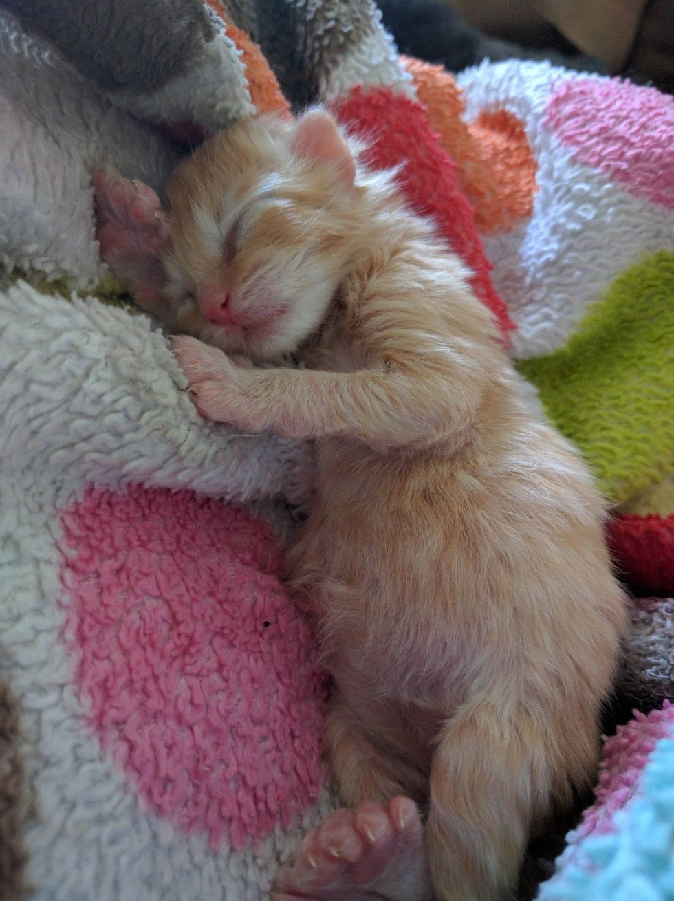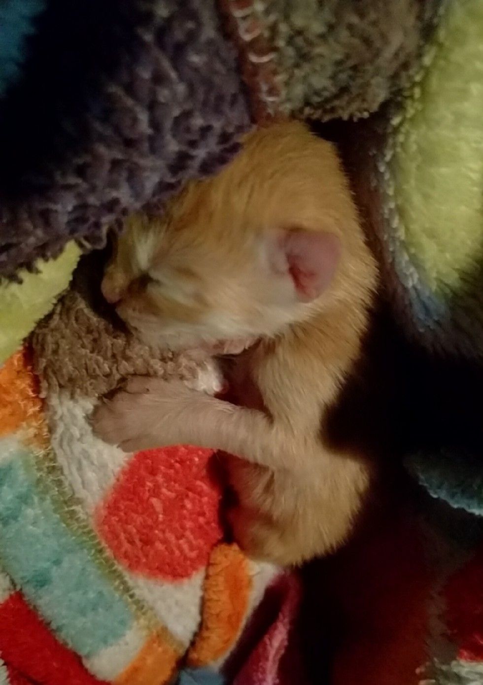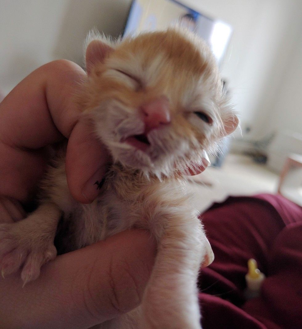 A newborn ginger kitten went from weighing almost nothing to now 5 ounces, loving life to the fullest.