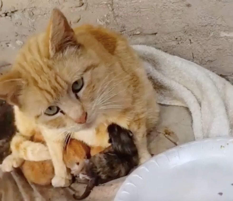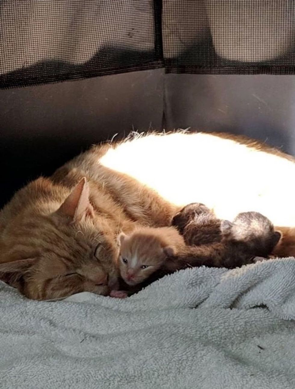 A stray cat was found cuddling with her newborn kittens on a cold, rainy day. She kept them safe until help arrived.