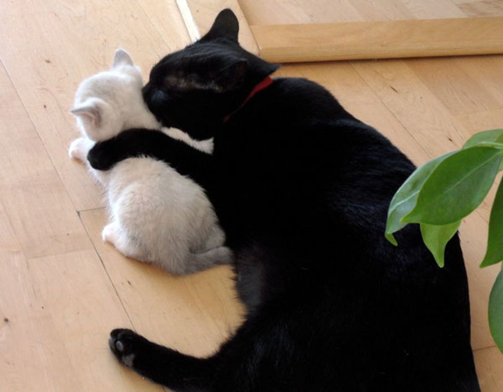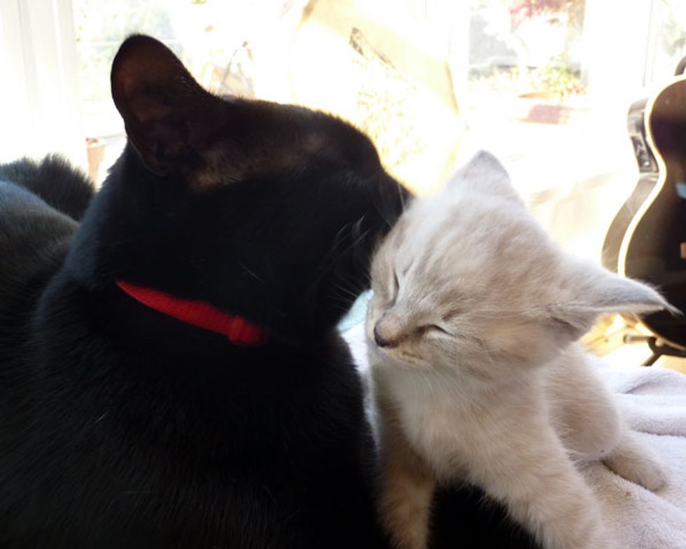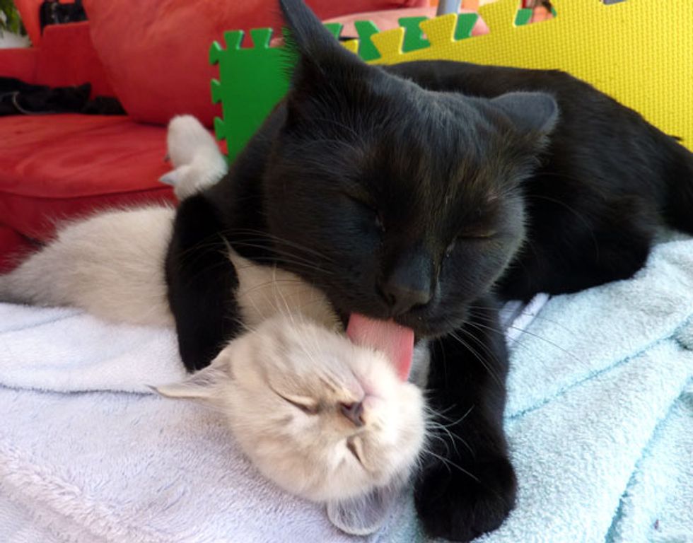 Freya met one of the new foster kittens and fell in love. Right away she took to him and treated him like her own. She cleans her little buddy and is very protective around him, giving him all the motherly love she can provide.