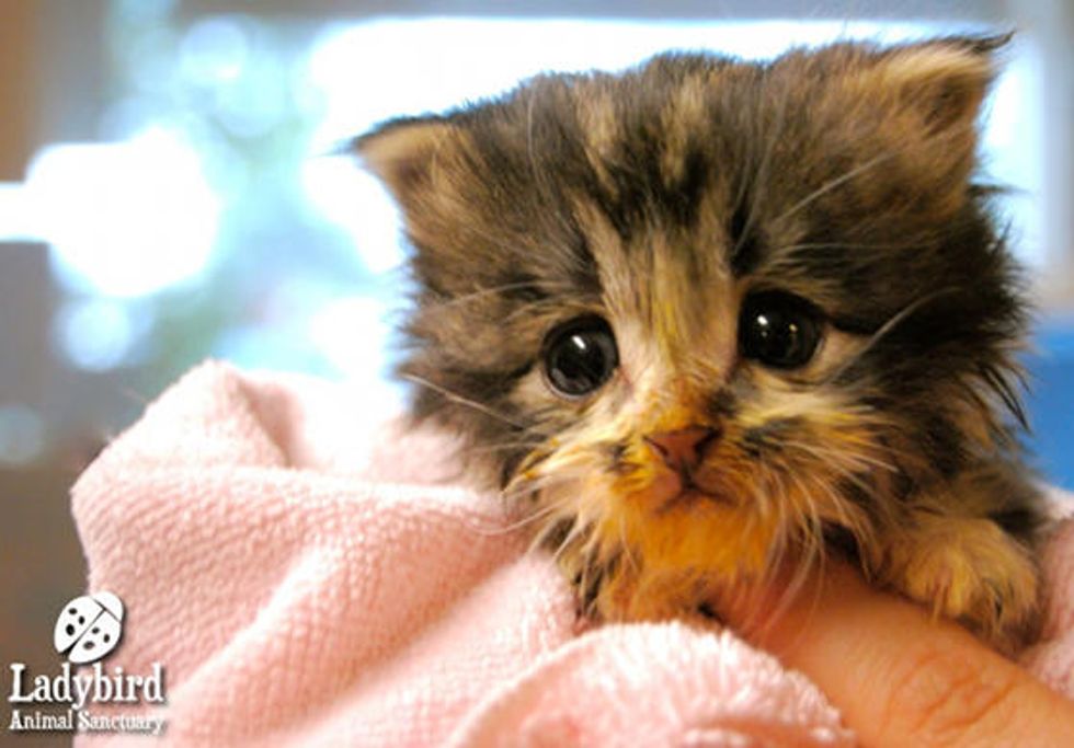 Lisa wrote: The Ladybird Animal Sanctuary rescued this little bean today...and that will be his name! Little Bean came into a high-kill shelter as a stray, with no siblings and no mom. He's only about three weeks old. He was in a big metal cage, shaking and crying all by himself, and we just couldn't leave him there like that. Little Bean is now safe and warm in his foster home, and will be available for adoption when he is big and strong enough.