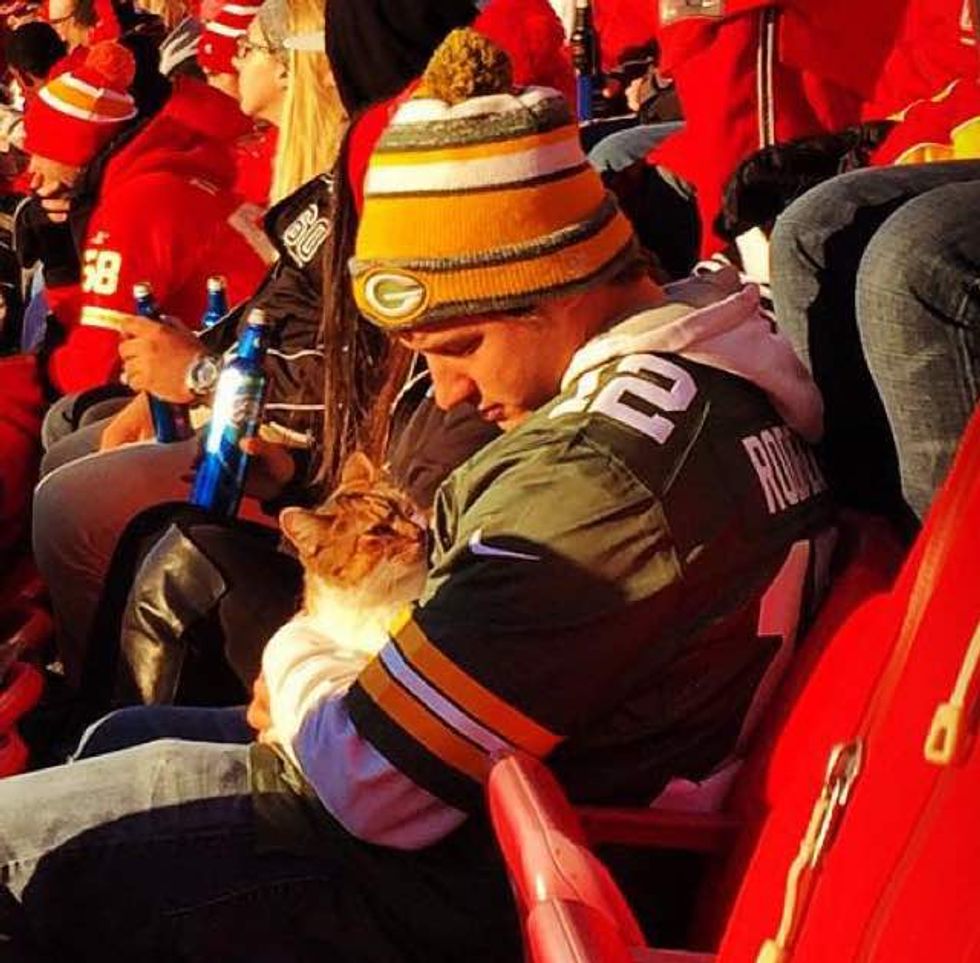 During the Raiders-Chiefs game, a man wearing a Packers jersey was found holding a cat in the stands at Arrowhead Stadium.