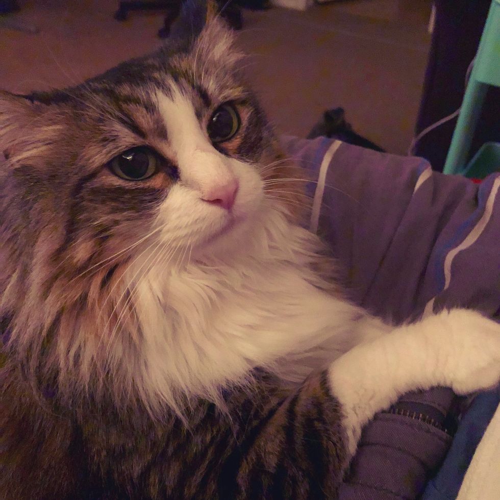This 14 year old fluffy cat will meow at her human dad until he picks her up and holds her.