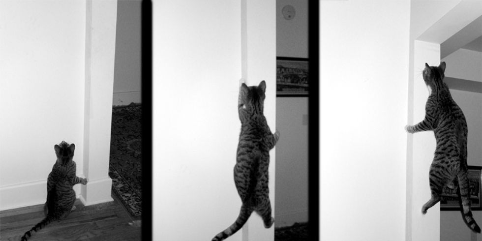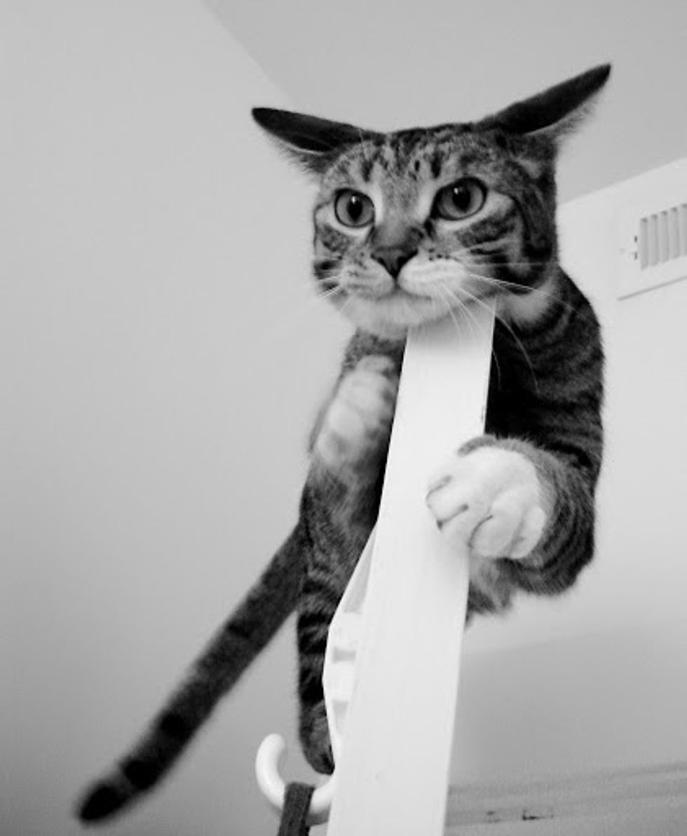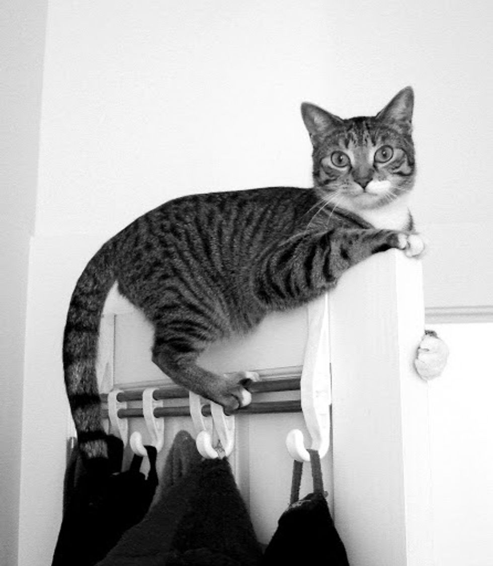 I've had cats all my life but Henry Jones is unlike any other cat I've ever lived with. He climbs hanging clothes and hat racks, curtains and roman blinds, doorways and doors. You'll be in a room and sense that you are not alone and then realize he has crept into a cabinet and is watching you from its depths. He's broken every lamp that doesn't have a weighted base. He loves to creep under laundry and damp towels left lying around and if you leave a jacket hanging on a chair, he'll pull it down and then burrow inside it and creep down inside a sleeve for a nap. There's no way to safely change the sheets on a bed while he's in the room.